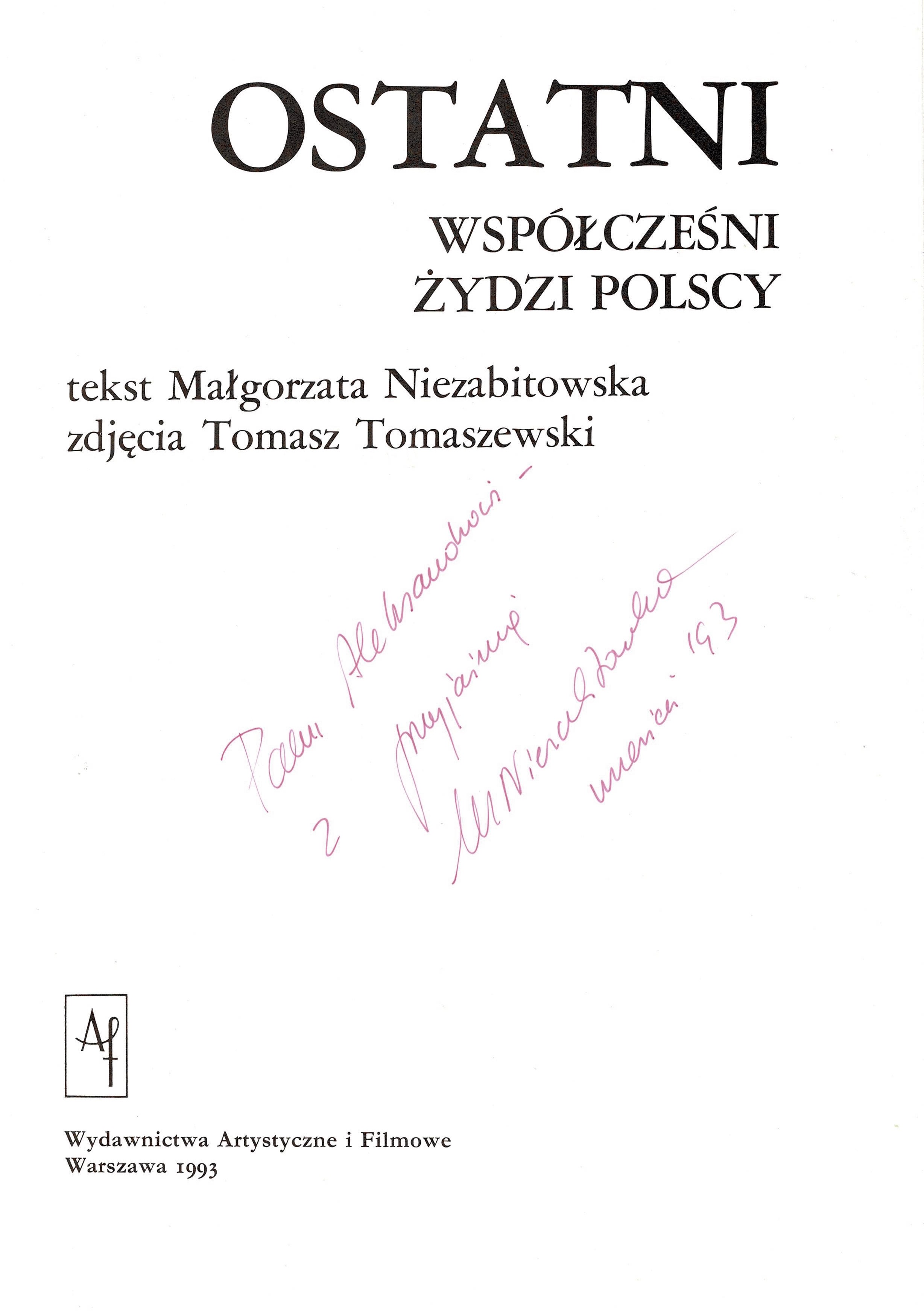 Treść dedykacji: Panu Aleksandrowi - z przyjaźnią Niezabitowska kwiecień '93.