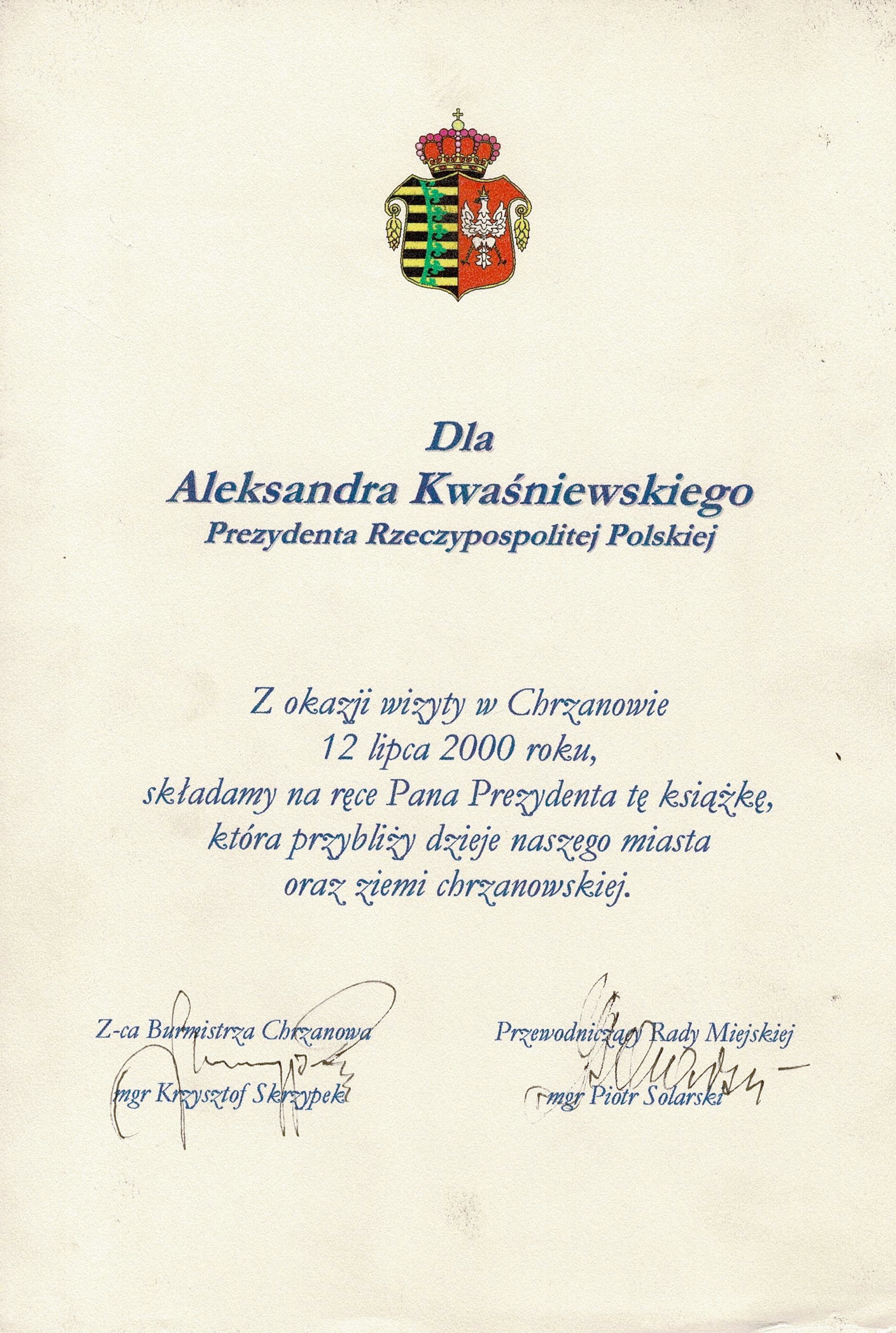 Treść dedykacji: Dla Aleksandra Kwaśniewskiego Prezydenta Rzczypospolitej Polskiej z okazji wizyty w Chrzanowie 12 lipca 2000 roku, składamy na ręce Pana Prezydenta tę książkę, która przybliży dzieje naszego miasta oraz ziemi chrzanowskiej. Z-ca Burmistrza Chrzanowa mgr Krzysztof Skrzypek, Przewodniczący Rady Miejskiej mgr Piotr Solarski