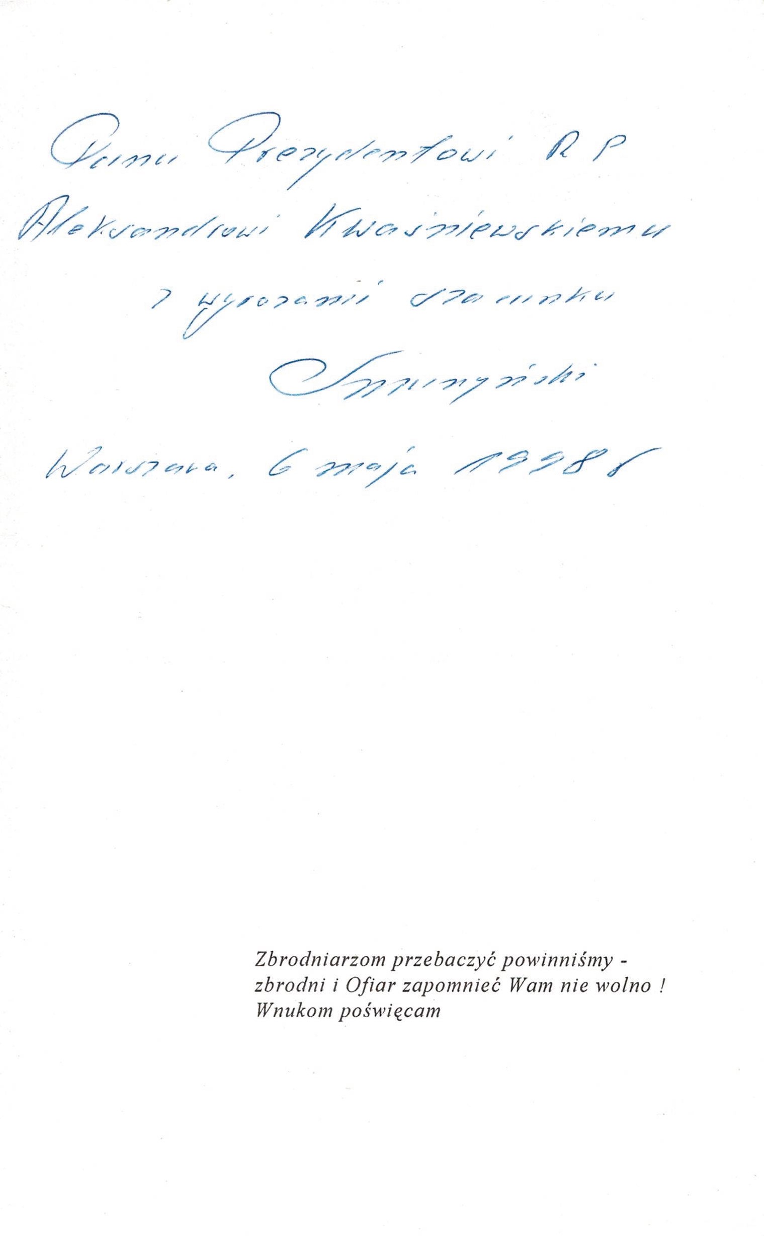 Treść dedykacji: Panu Prezydentowi RP Aleksandrowi Kwaśniewskiemu z wyrazami szacunku Smurzyński Warszawa, 6 maja 1998 r.