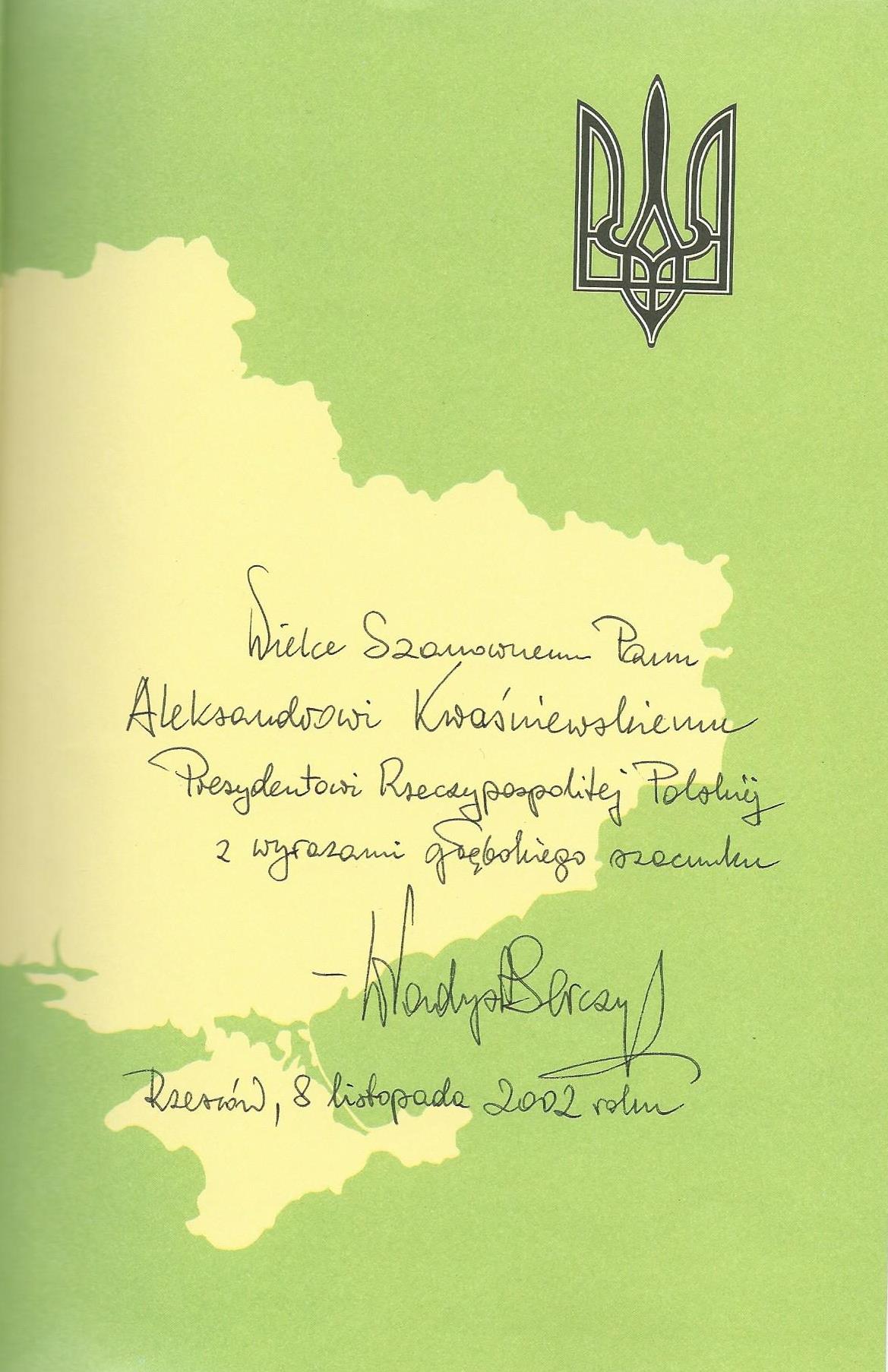 Treść dedykacji: Wielce Szanownemu Panu Aleksandrowi Kwaśniewskiemu Prezydentowi Rzeczypospolitej Polskiej z wyrazami głębokiego szacunku - Władysław A. Serczyk Rzeszów, 8 listopada 2002 roku