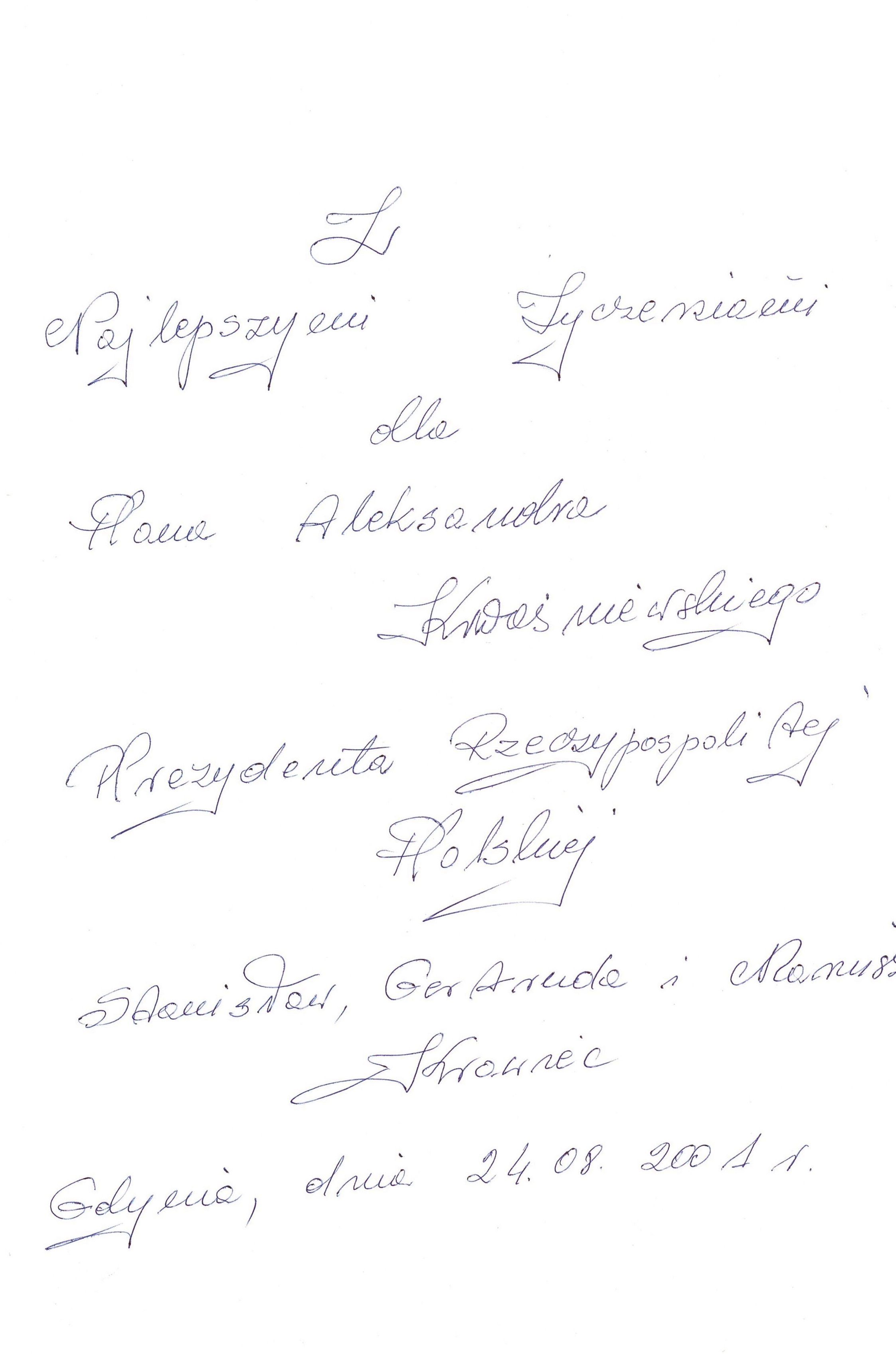 Treść dedykacji: Z najlepszymi życzeniami dla Pana Aleksandra Kwaśniewskiego Prezydenta Rzeczypospolitej Polskiej Stanisław, Gertruda i Mariusz Krawiec Gdynia, dnia 24.08.2001 r.