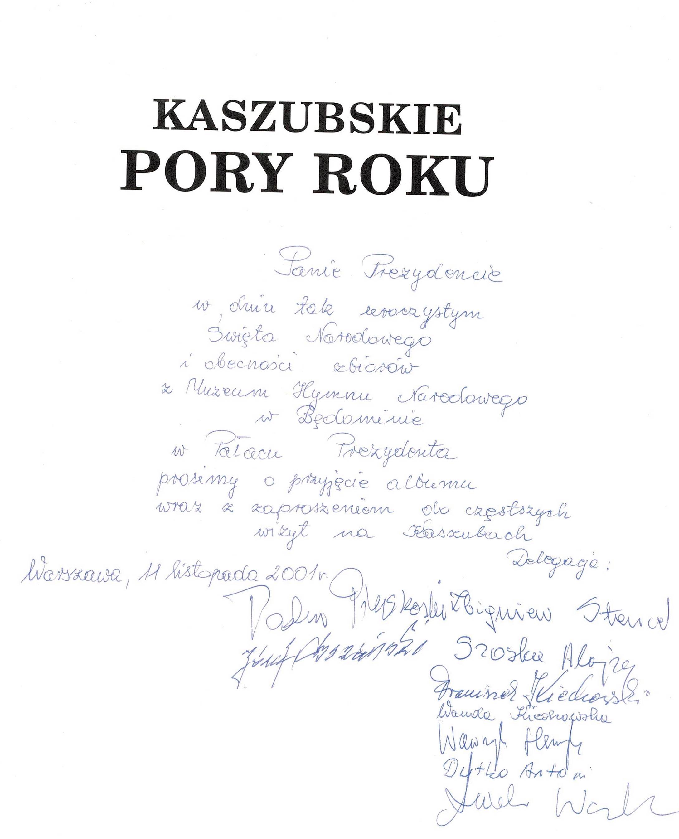 Treśc dedykacji: Panie Prezydencie w dniu tak uroczystym Święta Narodowego i obecności zbiorów z Muzeum Hymnu Narodowego w Będominie w Pałacu Prezydenta prosimy o przyjęcie albumu wraz z zaproszeniem do częstszych wizyt na Kaszubach, Warszawa, 11 listopada 2001 r. Delegacja : (nieczytelne)