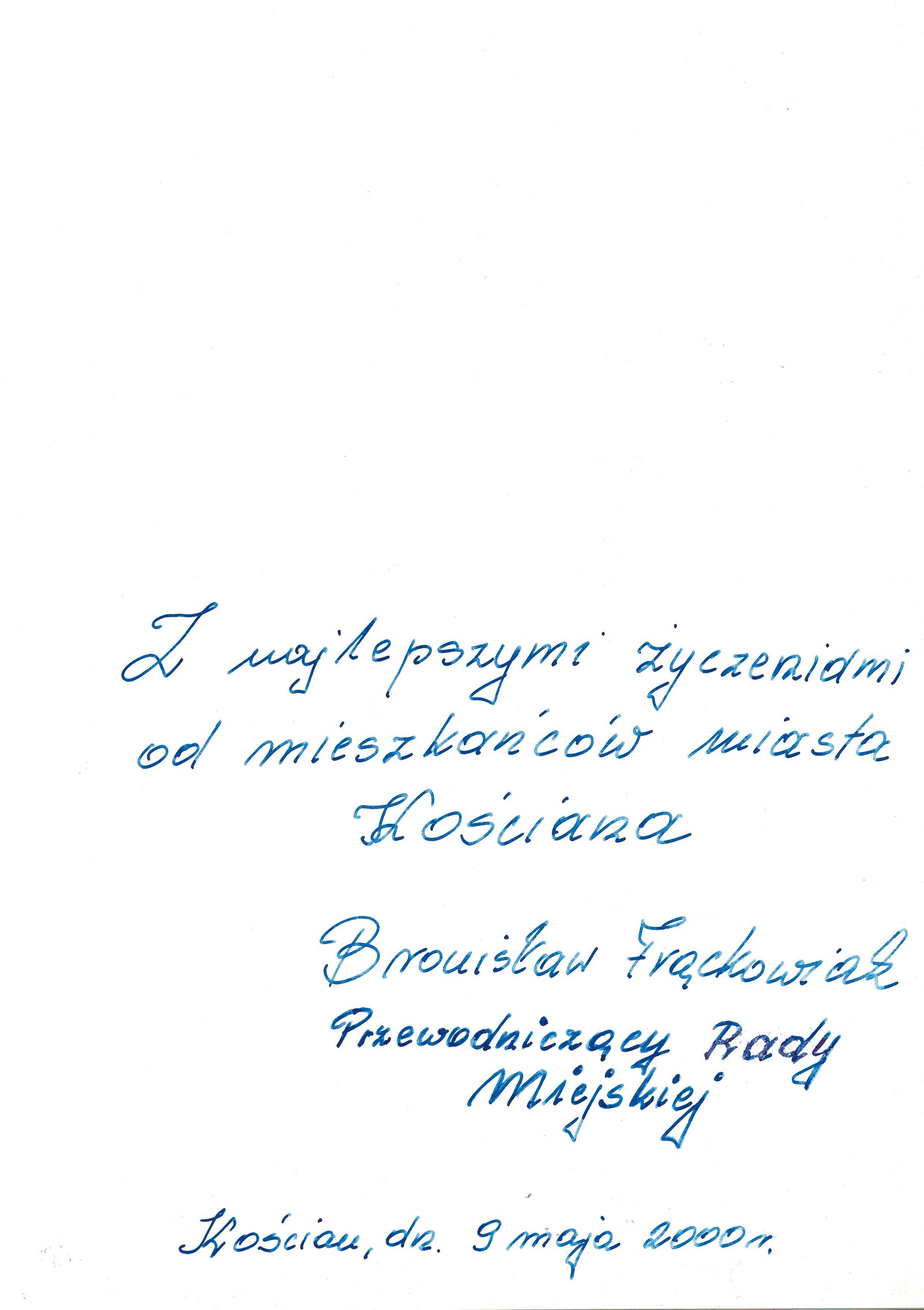 Treść dedykacji: Z najlepszymi życzeniami od mieszkańców miasta Kościana Bornisław Frąckowiak Przewodniczący Rady Miejskiej Kościan, dn. 9 maja 2000 r.