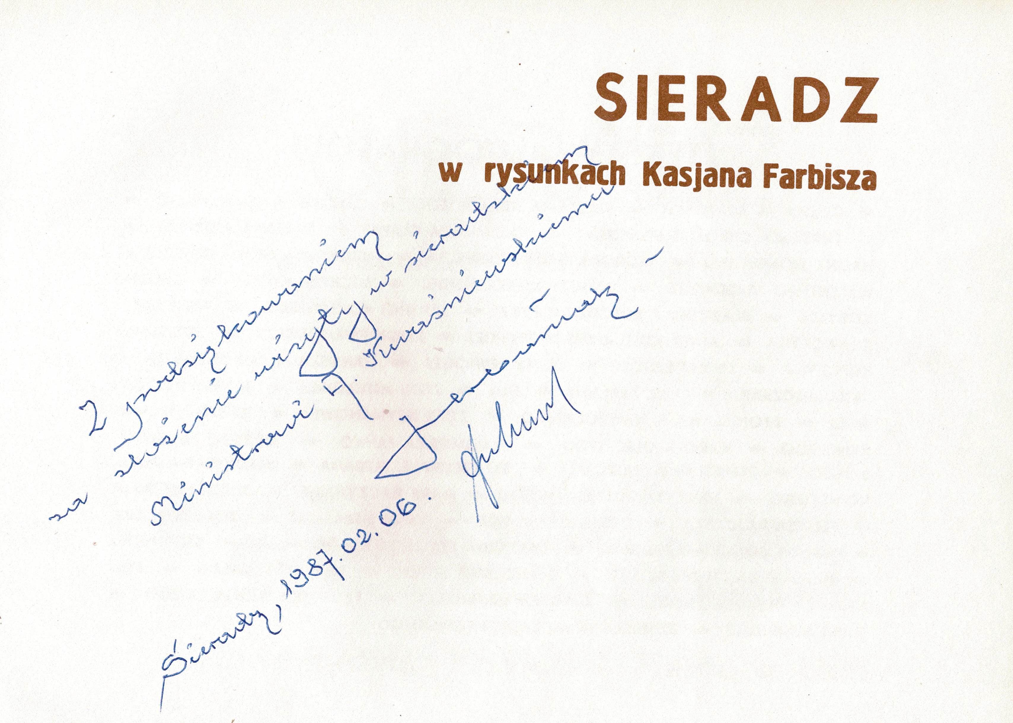 Treść dedykacji: Z podziękowaniem za złożenie wizyty w sieradzkim Ministrowi A. Kwaśniewskiemu
