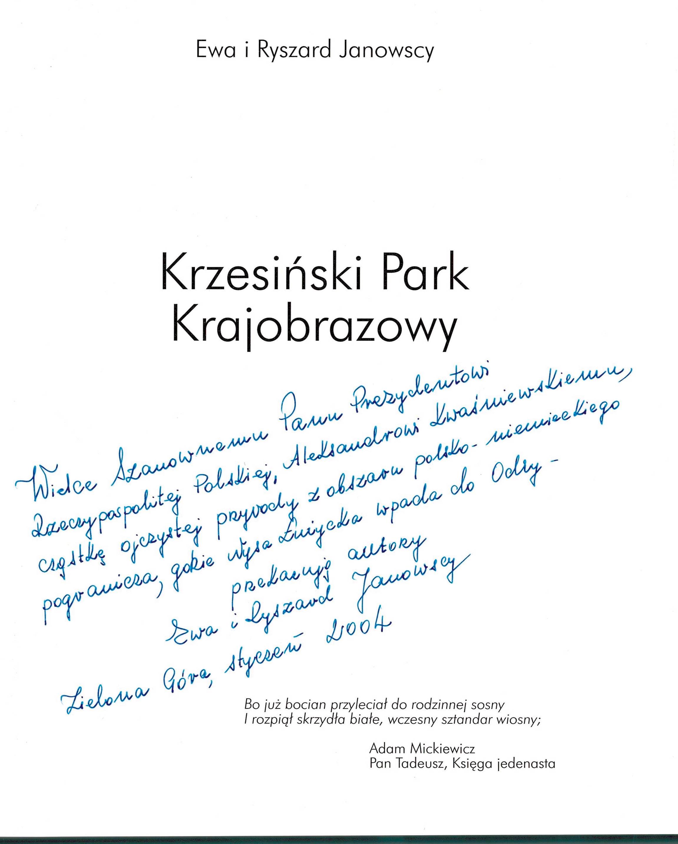 Treść dedykacji: Wielce Szanownemu Panu Prezydentowi Rzeczypospolitej Polskiej, Aleksandrowi Kwaśniewskiemu, cząstkę ojczystej przyrody z obszaru polsko-niemieckiego pogranicza, gdzię Nysa Łużycka wpada do Odry - przekazują autorzy Ewa i Ryszard Janowscy, Zielona Góra, styczeń 2004