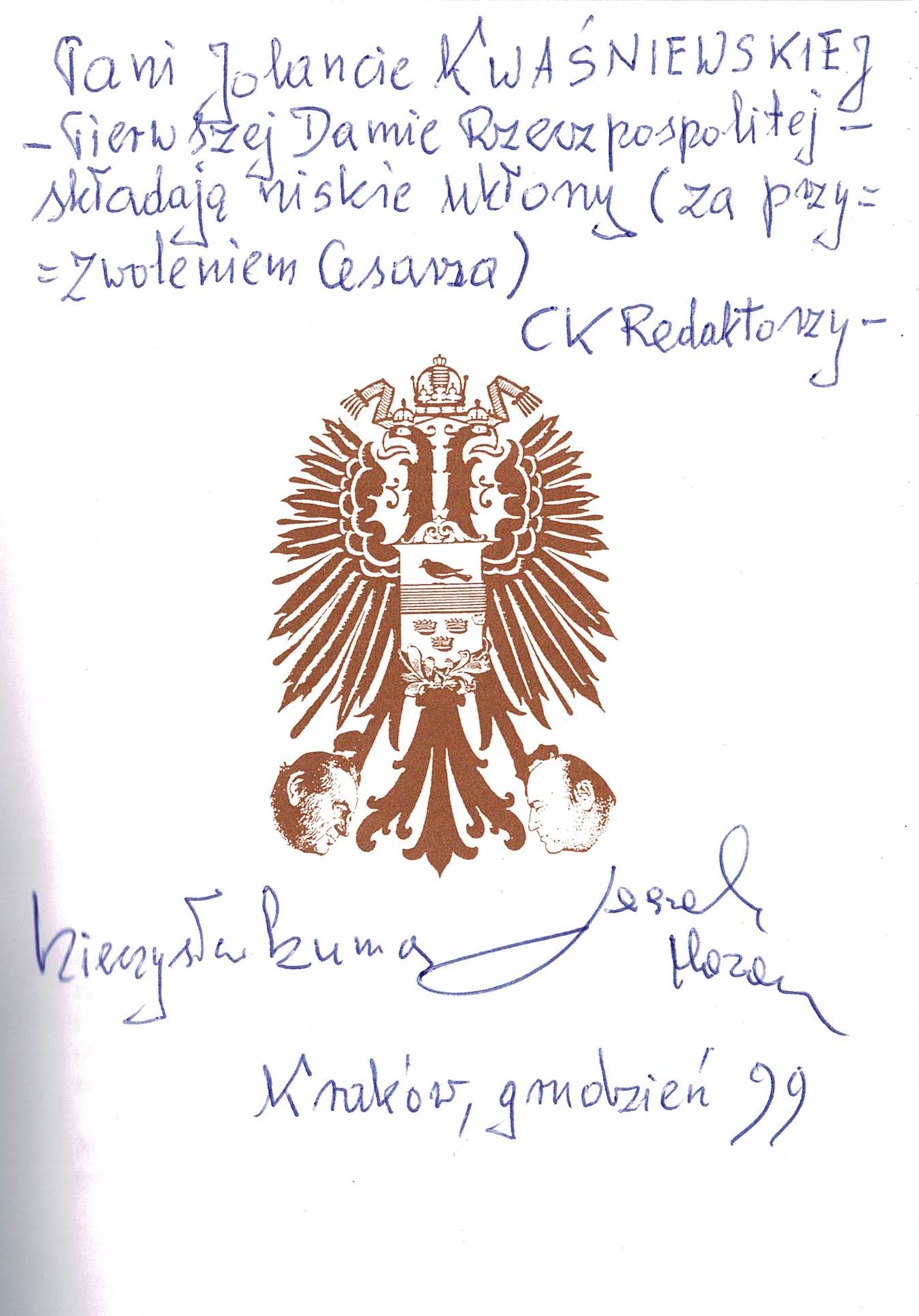 Treść dedykacji: Pani Jolancie Kwaśniewskiej - Pierwszej Damie Rzeczpospolitej składają niskie ukłony (za przyzwoleniem Cesarza)