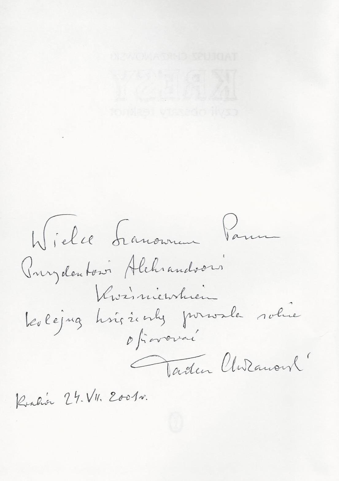 Treść dedykacji: Wielce Szanownemu Panu Prezydentowi Aleksandrowi Kwaśniewskiemu kolejną ksiązkę pragnę ofiarować Tadeusz Chrzanowski Kraków 24. VII. 2001 r.