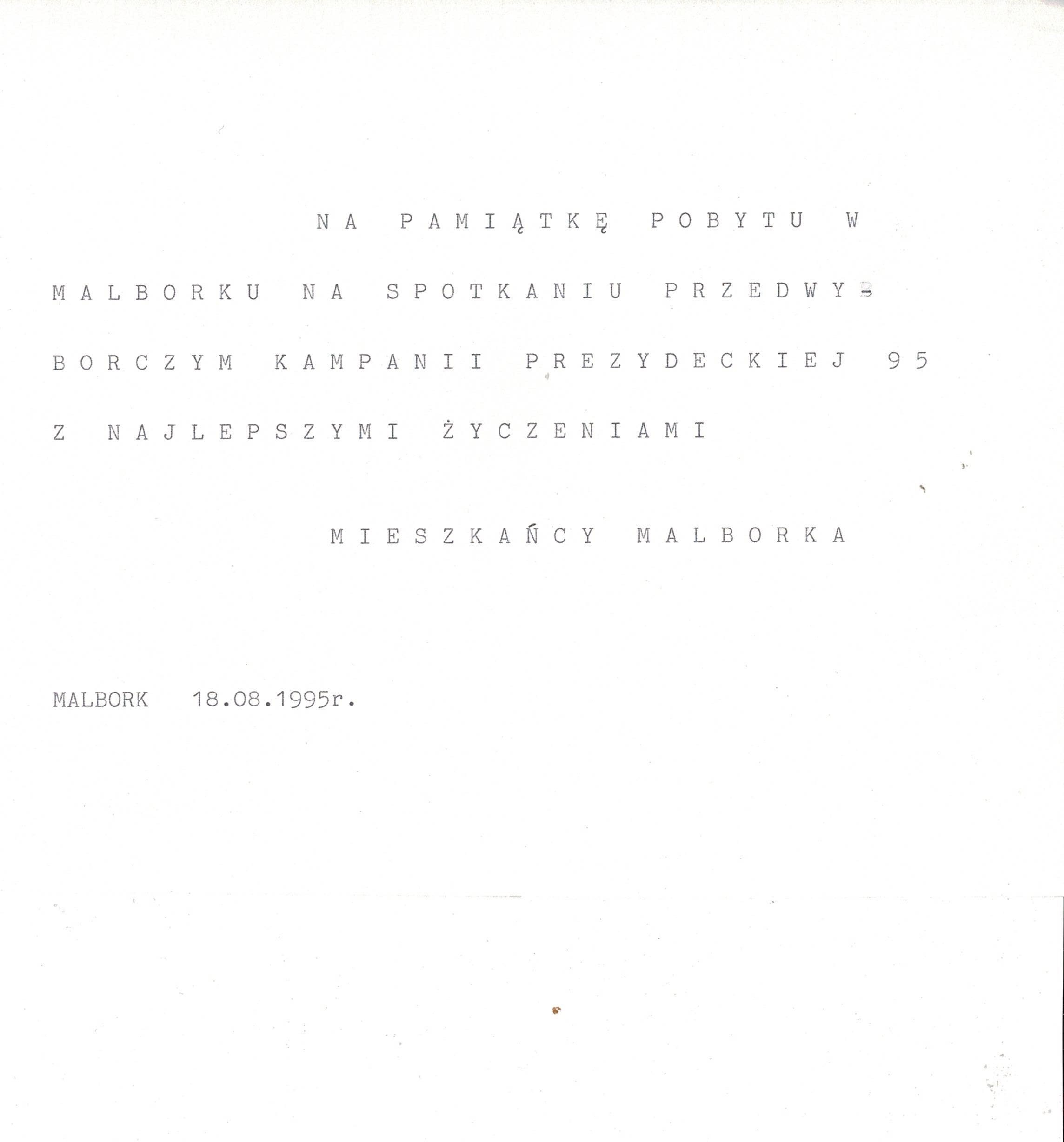 Treść dedykacji: Na pamiątkę pobytu w Malborku na spotkaniu przedwyborczym kampanii prezydenckiej 95 z najlepszymi życzeniami Mieszkańcy Malborka Malbork 18.08.1995 r.