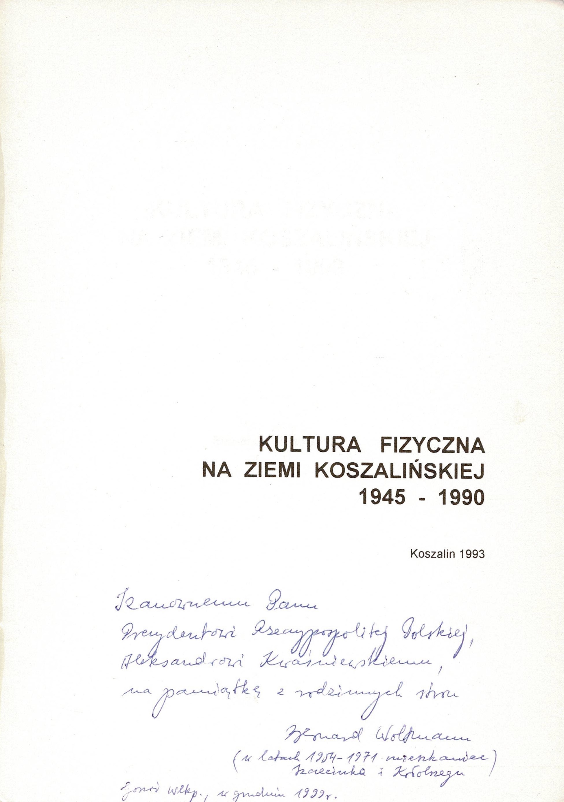Szanownemu Panu Prezydentowi Rzeczypospolitej Polskiej, Aleksandrowi Kwaśniewskiemu, na pamiątkę z rodzinnych stron Bernard Woltmann (w latach 1954-1971 mieszkaniec Szczecinka i Kołobrzegu) Gorzów Wlkp., w grudniu 1999 r.