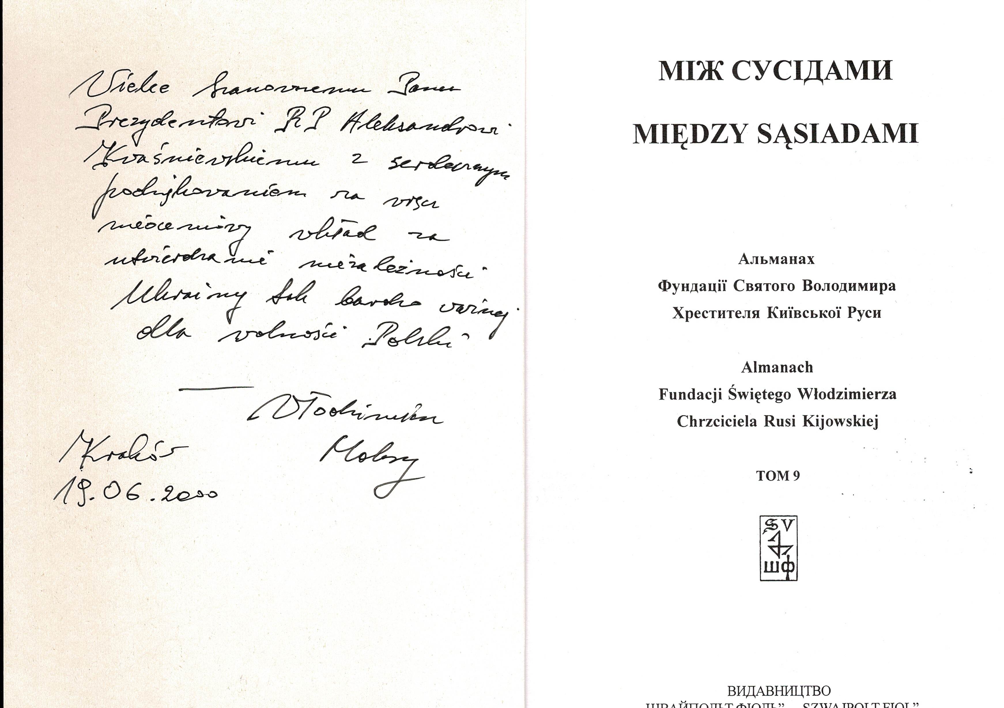 Treść dedykacji: Wielce Szanownemu Panu Prezydentowi RP Aleksandrowi Kwaśniewskiemu z serdecznym podziękowaniem za wręcz nieoceniony wkład za utwierdzenie niezależności. Uczcijmy tak bardzo ważnej dla wolności Polski. Włodzimierz Mokry