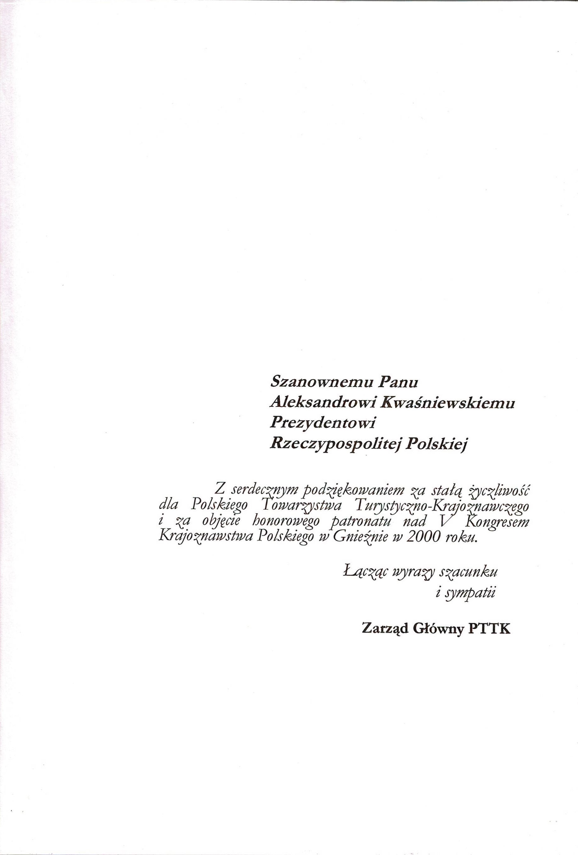 Treść dedykacji: Szanownemu Panu Aleksandrowi Kwaśniewskiemu Prezydentowi Rzeczypospolitej Polskiej Z serdecznymi podziękowaniami za stała życzliwość dla Polskiego Towarzystwa Turystyczno-Krajoznawczego i za objęcie honorowego patronatu nad V Kongresem Karjoznawstwa Polskiego w Gnieźnie w 2000 roku. Łącząc wyrazy szacunku i sympatii Zarząd Główny PTTK.
