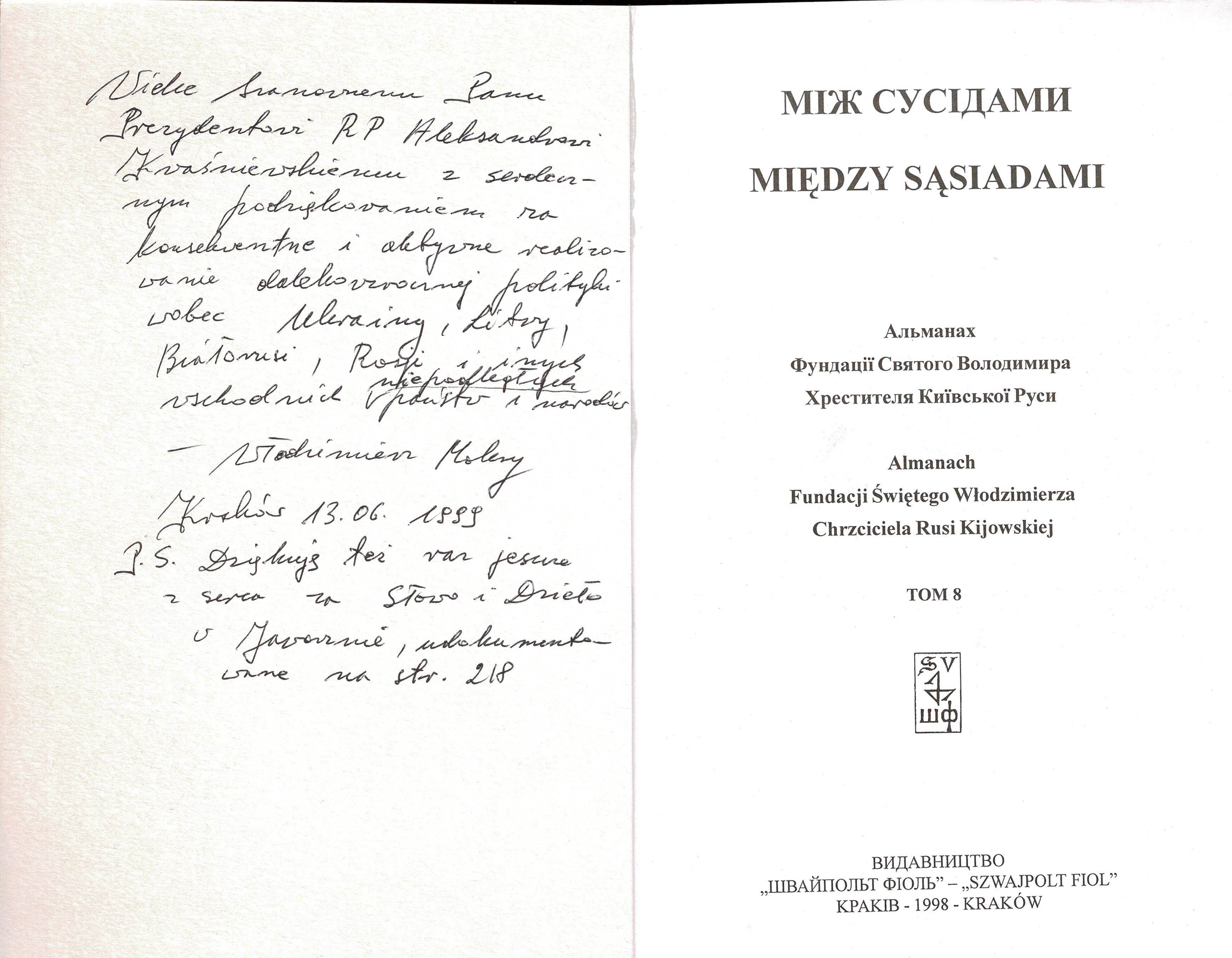 Treść dedykacji: Wielce Szanownemu Panu Prezydentowi RP Aleksandrowi Kwaśniewskiemu z serdecznym podziękowaniem za konsekwentne i aktywne realizowanie dalekoidącej polityki wobec Ukrainy , Litwy, Białorusi, Rosji i innych wschodnich nipodległych państw i narodów - Włodzimierz Mokry, Kraków 13.06.1999 P.S. Dziekuję też raz jeszcze z serca za słowo i dzieło w Jaworznie, udokumentowane na str. 218
