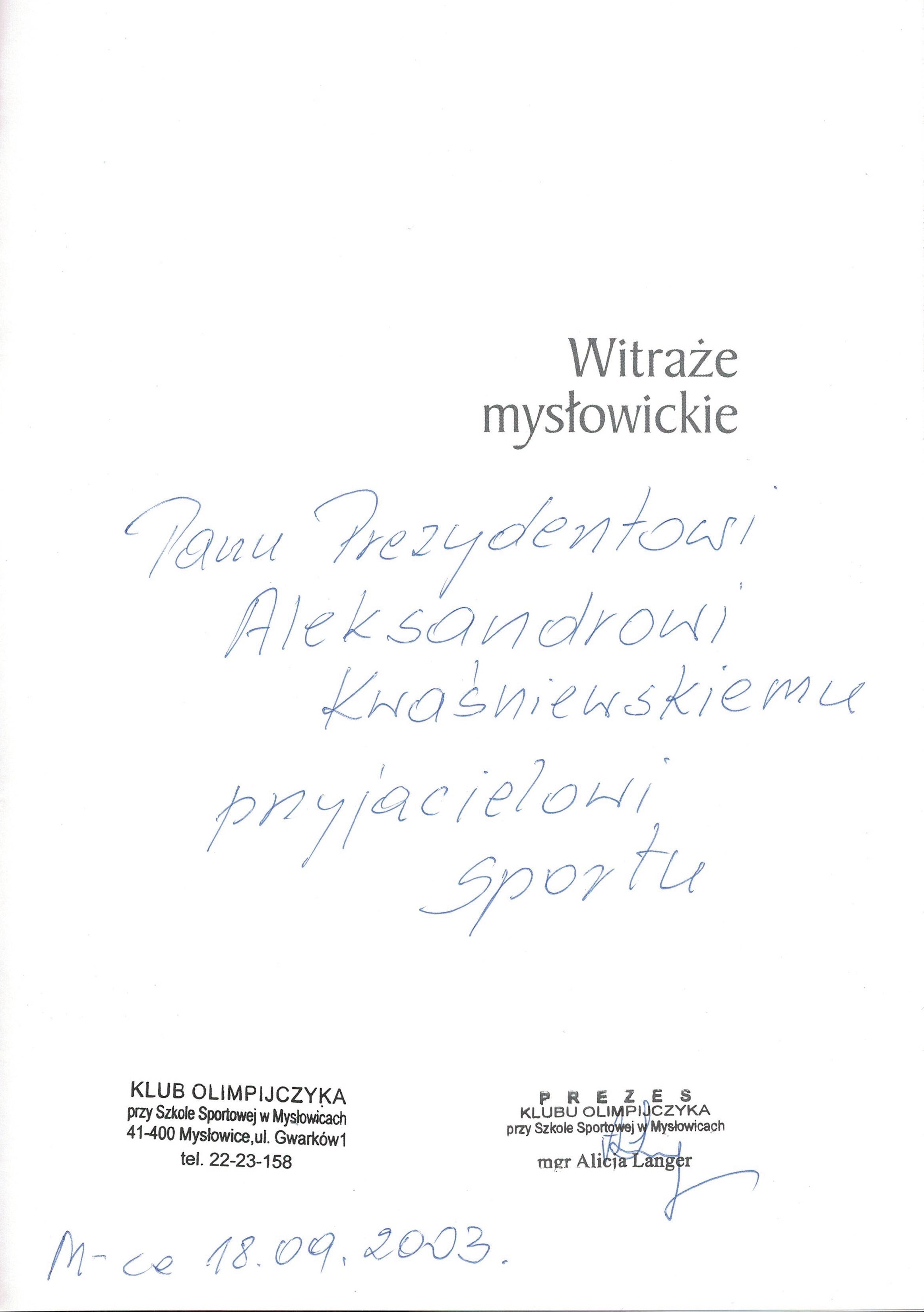 Treść dedykacji: Panu Prezydentowi Aleksandrowi Kwasniewskiemu przyjacielowi sportu Prezes Klubu Olimpijczyka przy Szkole Sportowej w Mysłowicach mgr Alicja Langer. M-ce 18.09.2003.