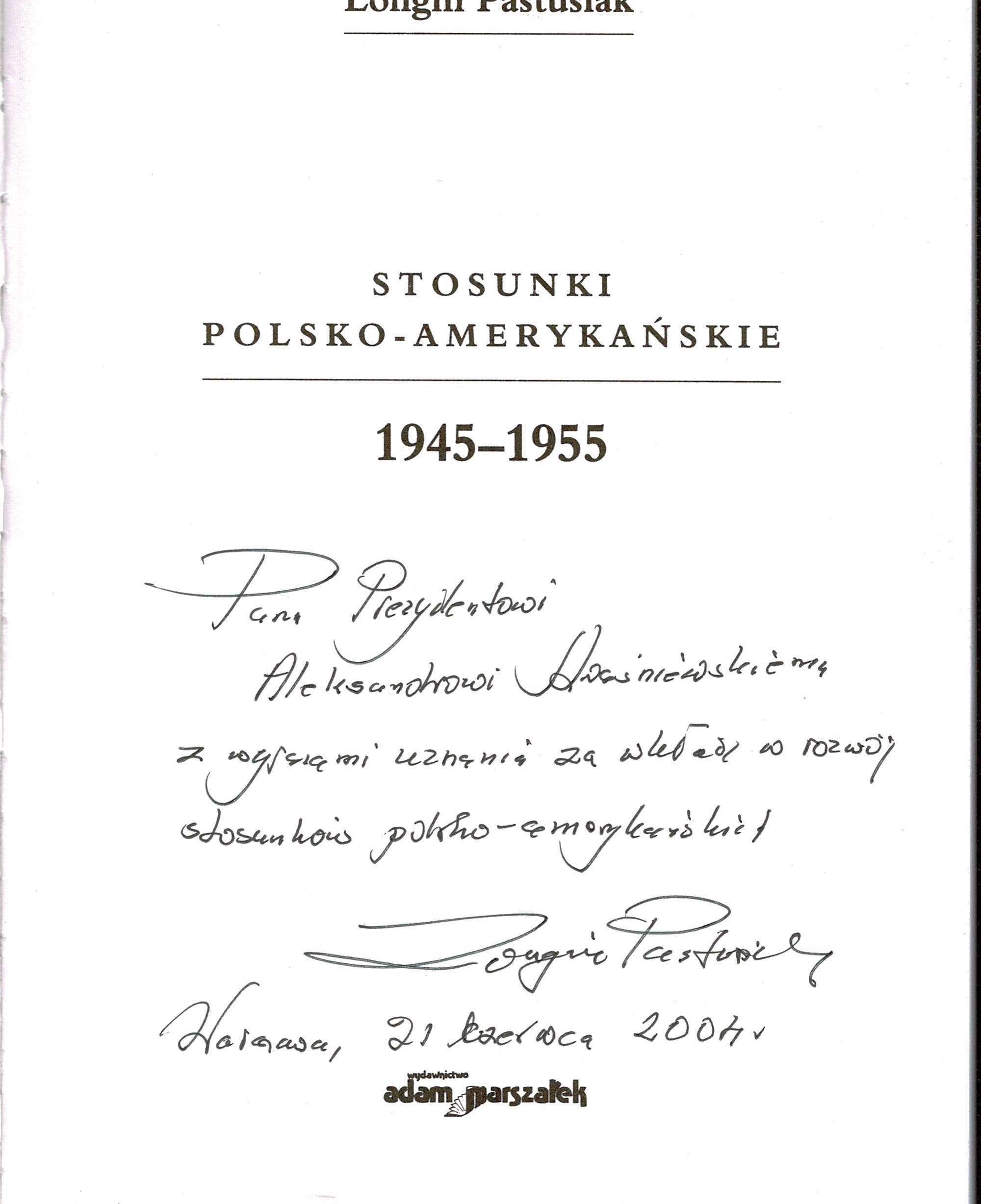 Treść dedykacji: Panu Prezydentowi Aleksandrowi Kwaśniewskiemu z wyrazami uznania za wkład w rozwój stosunków polsko-amerykańskich Longin Pastusiak Warszawa, 21 czerwca 2004 r.