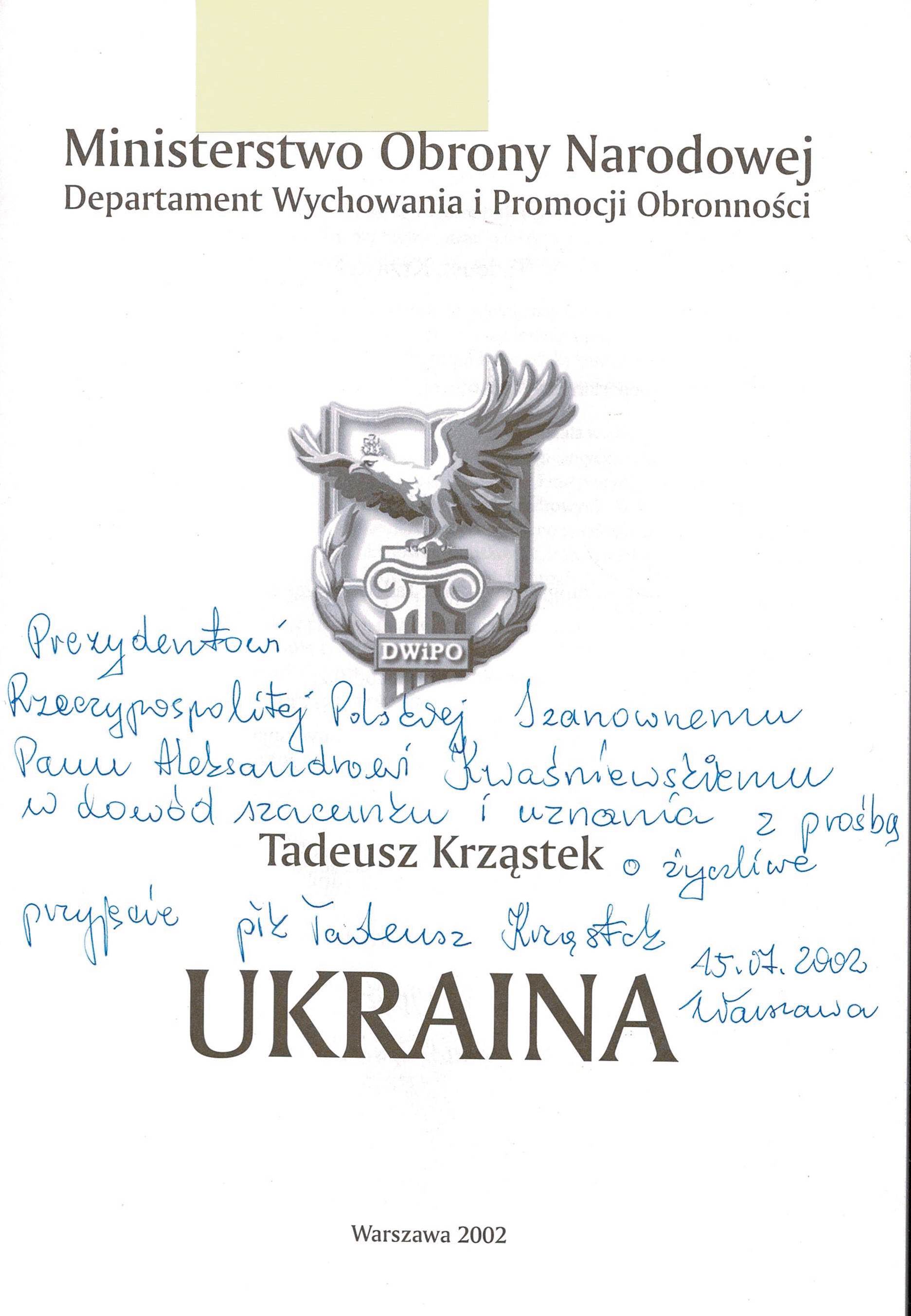 Treść dedykacji: Prezydentowi Rzeczypospolitej Polskiej Szanownemu Panu Aleksandrowi Kwaśniewskiemu w dowód szacunku i uznania z prośbą o życzliwe przyjęcie pik Tadeusz Krząstek 15.07.2002 Warszawa