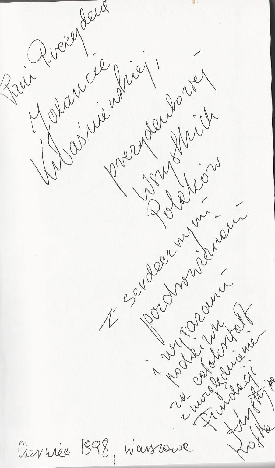 Treść dedykacji: Pani Prezydentowej Jolancie Kwaśniewskiej, prezydentowej Wszystkich Polaków. Z serdecznymi pozdrowieniami i wyrazami podziwu za całokształt z uwzględnieniem Fundacji Krystyna Kofta. Czerwiec 1998, Warszawa
