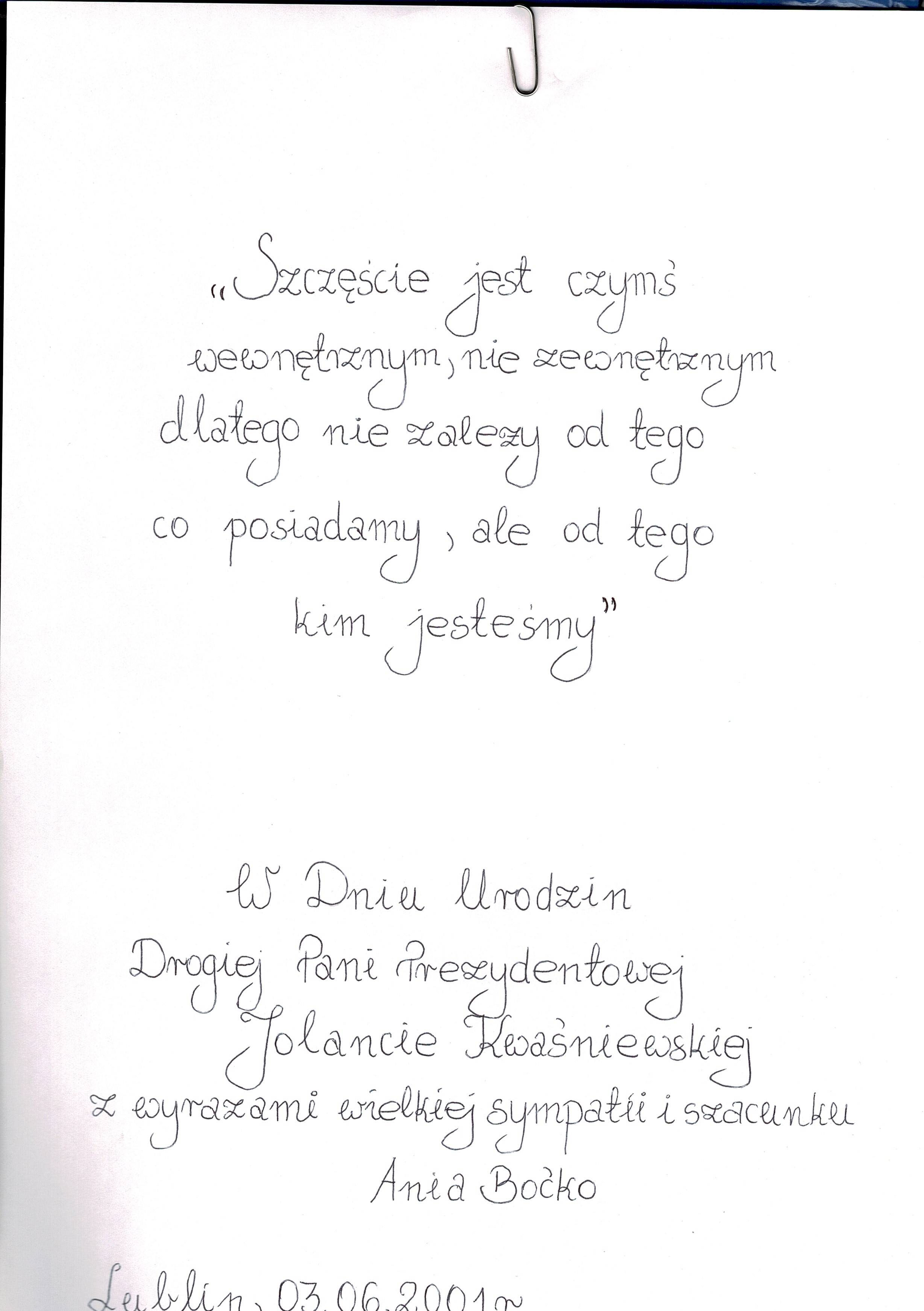 Treść dedykacji: "Szczęście jest czymś wewnętrznym, nie zewnętrznym dlatego nie zależy od tego co posiadamy, ale od tego kim jesteśmy" W Dniu Urodzin Drogiej Pani Prezydentowej Jolancie Kwaśniewskiej z wyrazami wielkiej sympatii i szacunku Ania Boćko Lublin, 03.06.2001 r.
