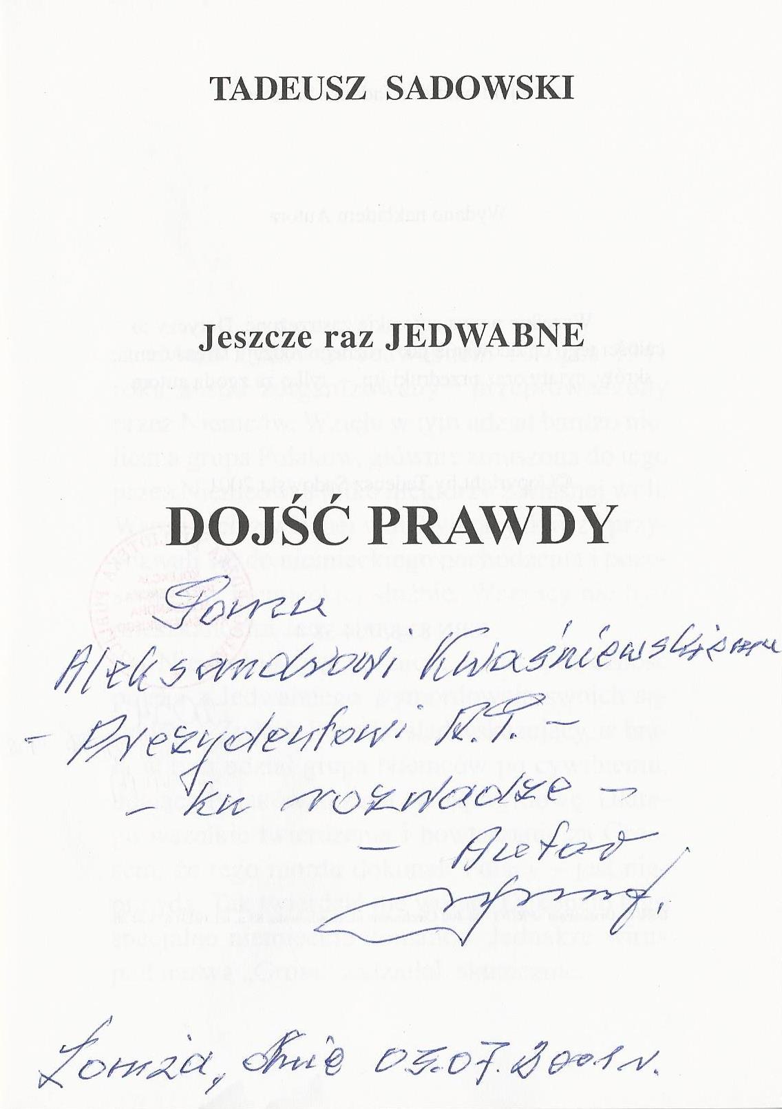 Treść dedykacji: Panu Aleksandrowi Kwaśniewskiemu - Prezydentowi RP - ku rozwadze- autor, Sadowski. Łomża, dnia 05.07.2001r.