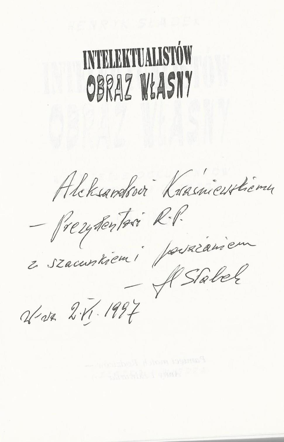 Treść dedykacji: Aleksandrowi Kwaśniewskiemu- Prezydentowi R.P. z szacunkiem i poważaniem - H.Słabek W-wa 2.VI.1997