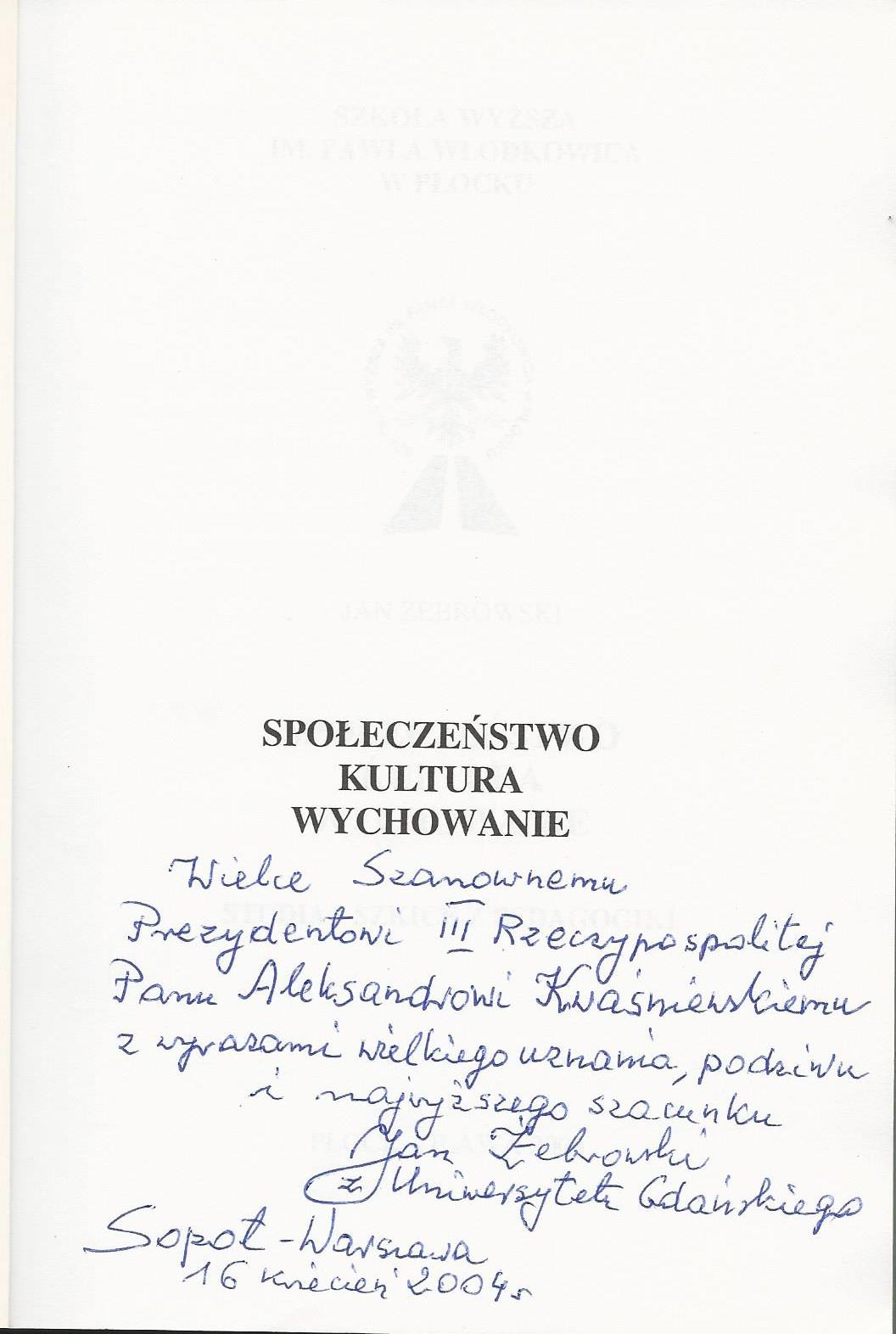 Treść dedykacji: Wielce Szanowanemu Prezydentowi III Rzeczypospolitej Panu Aleksandrowi Kwasniewskiemu z wyrazami wielkiego uznania ,podziwu i nakwyższego szacunku Jan Żebrowski z Uniwersytetu Gdańskiego Sopot-Warszawa 16 kwiecień 2004 r