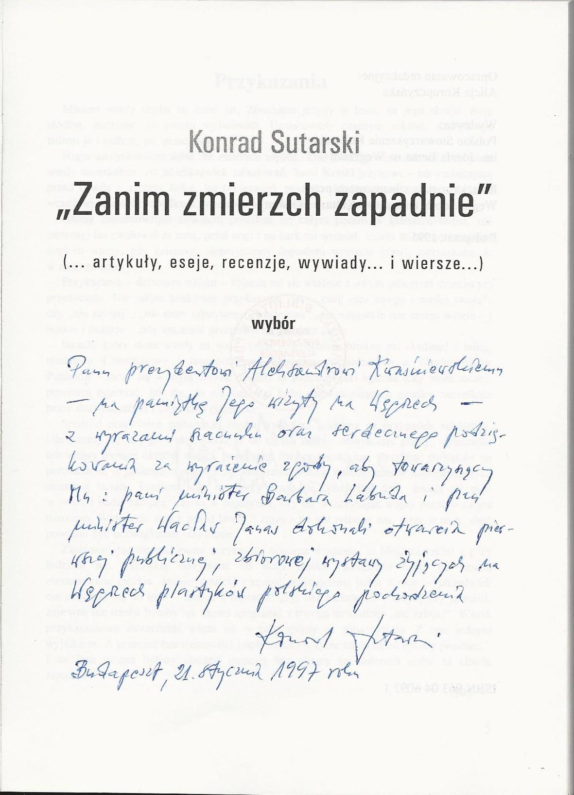 Treść dedykacji: panu prezydentowi Aleksandrowi Kwasniewskiemu- na pamiątke Jego wizyty na Węgrzech- z wyrazami szacunku oraz serdecznego podziękowania za wrażanie zgody, aby towarzyszący Mu: (treść dedykacji nie czytelan) dokonali otwarcia pierwszej publicznej, zbiorowej wystawy zyjących na Węgrzech plastyków polskiego pochodzenia Konrad Sutarski Budapeszt,21 stycznia 1997 roku
