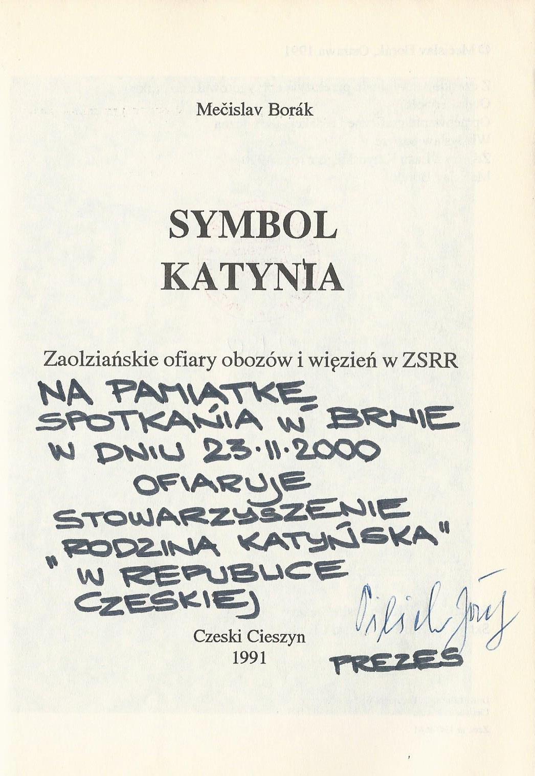 Treść dedykacji: NA PAMIĄTKĘ SPOTKANIA W BRNIE W DNIU 23.II.2000 OFIARUJE STOWARZYSZENIE "RODZINA KATYŃSKA" W REPUBLICE CZESKIEJ PREZES