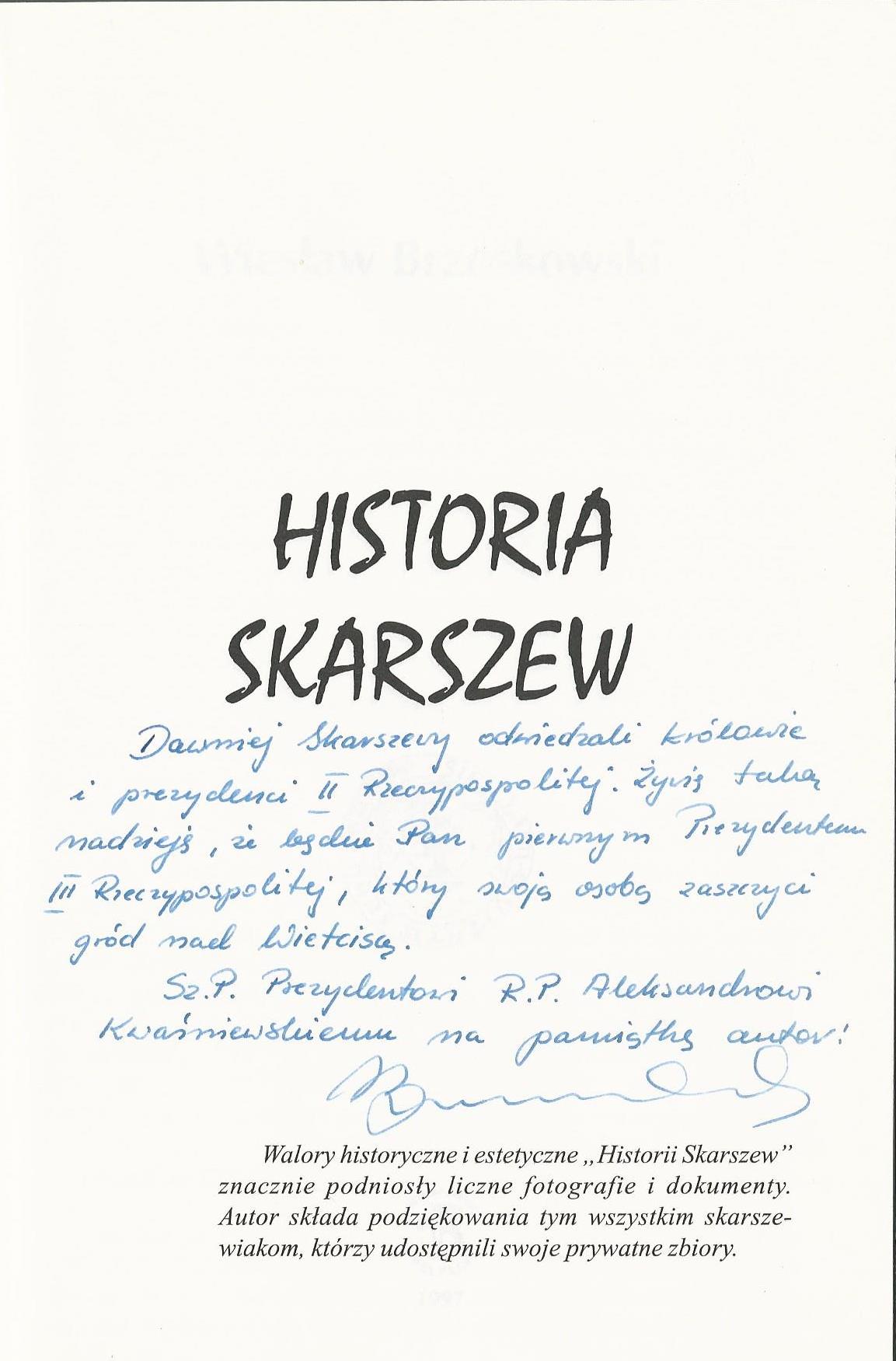Treść dedykacji: Dawnej Skarszewy odwiedzali królowie i prezydenci II Rzeczypospolitej. Żywię taką nadzieję, że będzie Pan pierwszym Prezydentem III Rzeczypopolitej, który swoją osobą zaszczyci gród nad Witecią. Sz. P. Prezydentowi R.P. Aleksandrowi Kwasniewskiemu na pamiątkę autor W.Brzoskowski