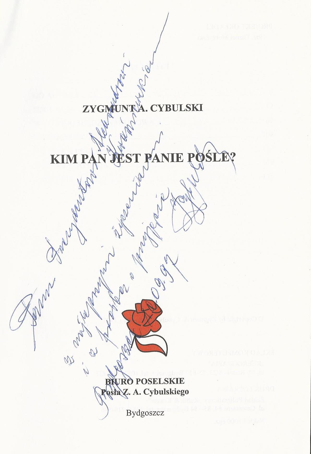 Treść dedykacji: Panu Prezydentowi Aleksandrowi Kwasniewskiemu z najlepszymi życzeniami i z prośbą o przyjęcie Z.A.Cybulski Bydgoszcz 12.09.97