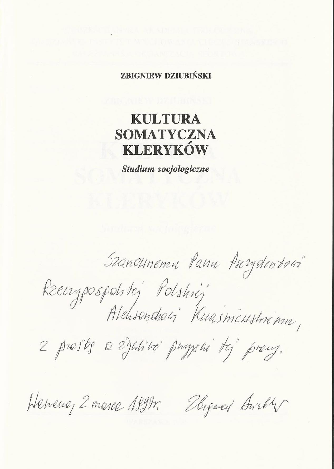 Treść dedykacji: Szanownemu Panu Prezydentowi Rzeczypospolitej Polskiej Aleksandrowi Kwaśniewskiemu, z prośbą o życzliwe przyjęcie tej pracy. Warszawa, 2 marca 1997r. Zbigniew Dziubiński