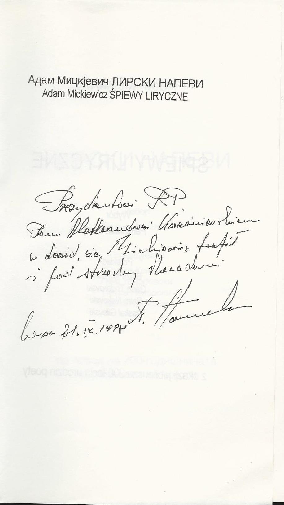 Treść dedykacji: Prezydentowi RP Panu Aleksandrowi Kwasniewskiemu w dowód, że Mickiewicz (dalsza część dedykacji nieczytelna)