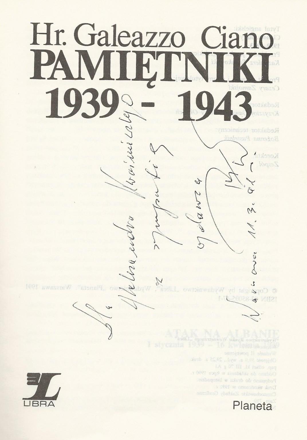 Treść dedykacji: Dla Aleksandra Kwaśniewskiego z sympatią Warszawa 11.3.91 r.