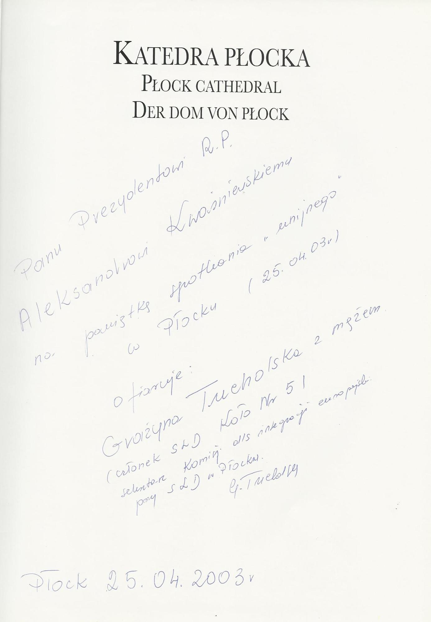Treść dedykacji: Panu Prezydentowi R.P. Aleksandrowi Kwaśniewskiemu na pamiątkę spotkania "unijnego" w Płocku (25.04.03r.) ofiaruje: Grażyna Tuholska z mężem (członek SLD Koło Nr 5/ sekretarz Komisji ds ingerencji europejskiej przy SLD w Płocku. E. Tuholski Płock 25.04.2003 r