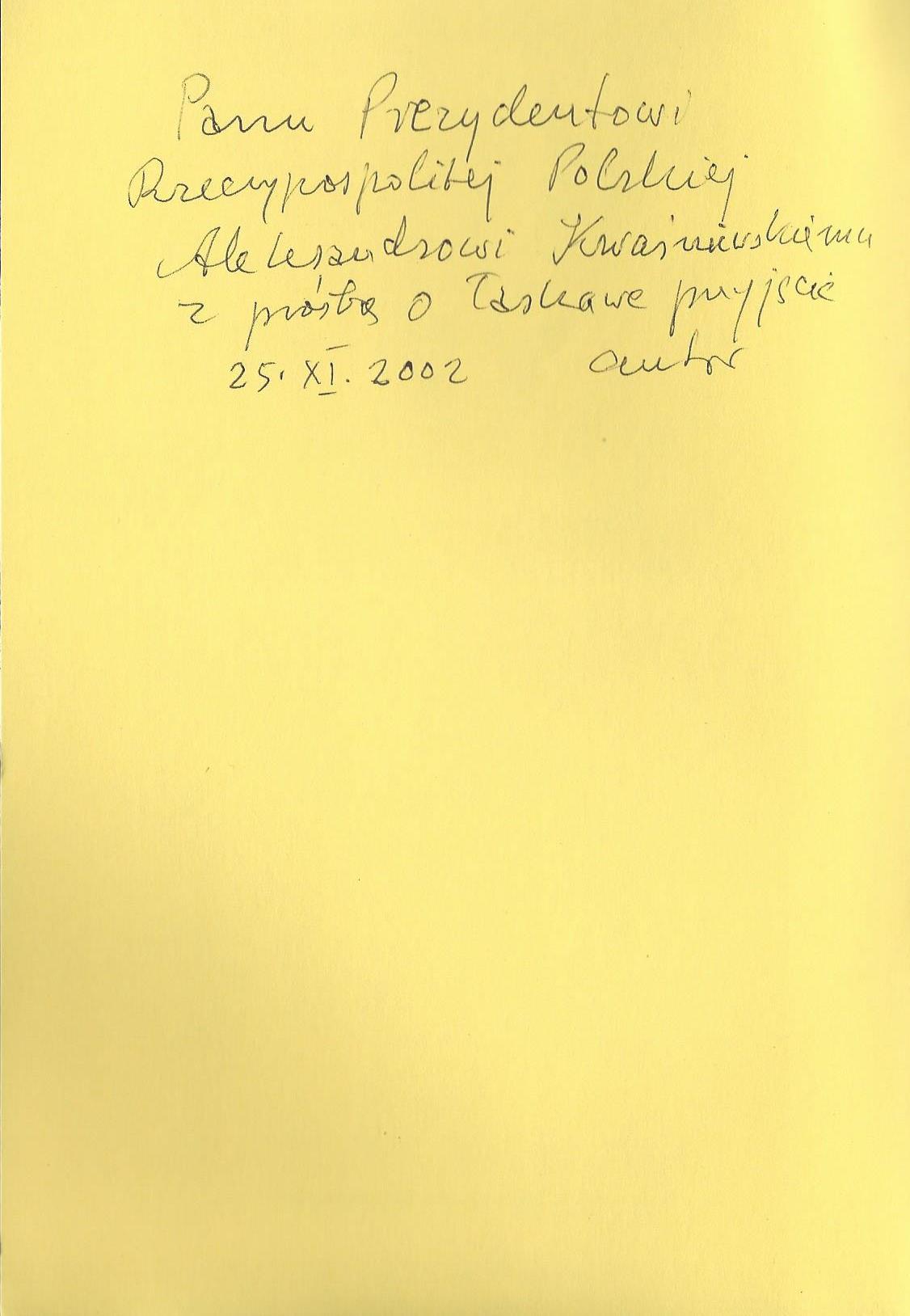 Treść dedykacji: Panu Prezydentowi Rzeczypospolitej Polskiej Aleksandrowi Kwaśniewskiemu z prośbą o łaskawe przyjęcie 25.XI.2002 autor