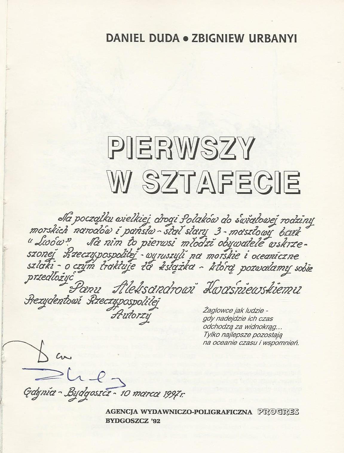 Treść dedykacji: Na początku wielkiej drogi Polaków do światowej rodziny morskich narodów i państw - stał stary 3- maszytowy bark "Lwów". Na nim to pierwsi młodzi obywatele wskrzeszonej Rzeczypospolitej - wyruszyli na morskie i oceaniczne szlaki - o czym traktuje ta książka - którą pozwalamy sobie przedłożyć Panu Aleksandrowi Kwaśniewskiemu Prezydentowi Rzeczypospolitej Autorzy D D Z Urbanyi Gdynia - Bydgoszcz - 10 marca 1997 r.