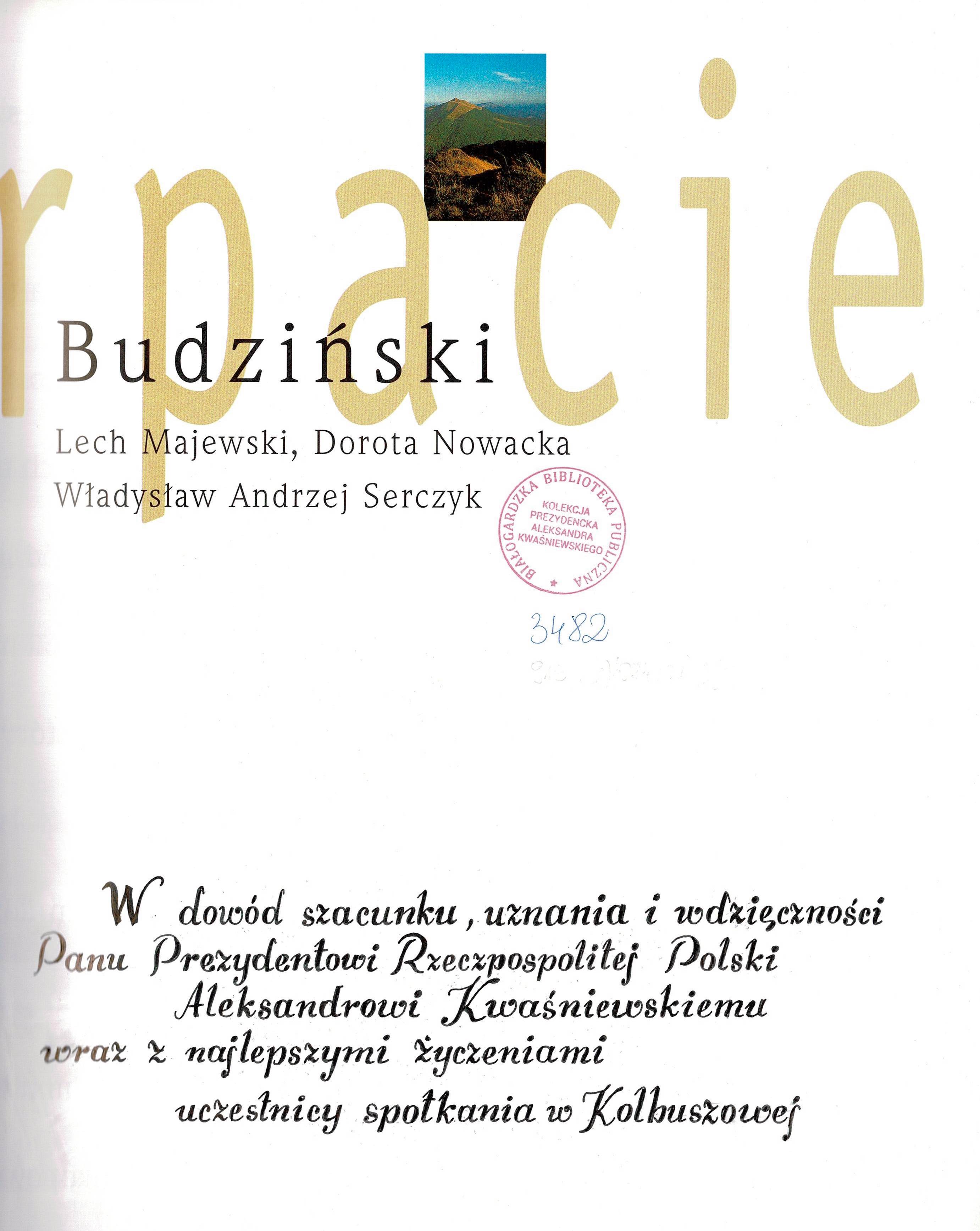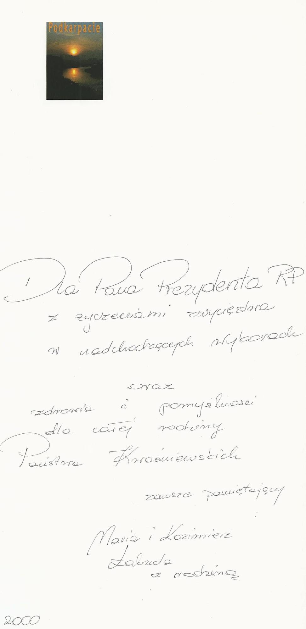 Treść dedykacji: Dla Pana Prezydenta RP z Życzeniami zwycięstwa w nadchodzących wyborach oraz zdrowia i pomyślności dla całej rodziny Państwa Kwaśniewskich zawsze pamiętający Maria i Kazimierz Łsbuda z rodziną Wrzawy 07.07.2000
