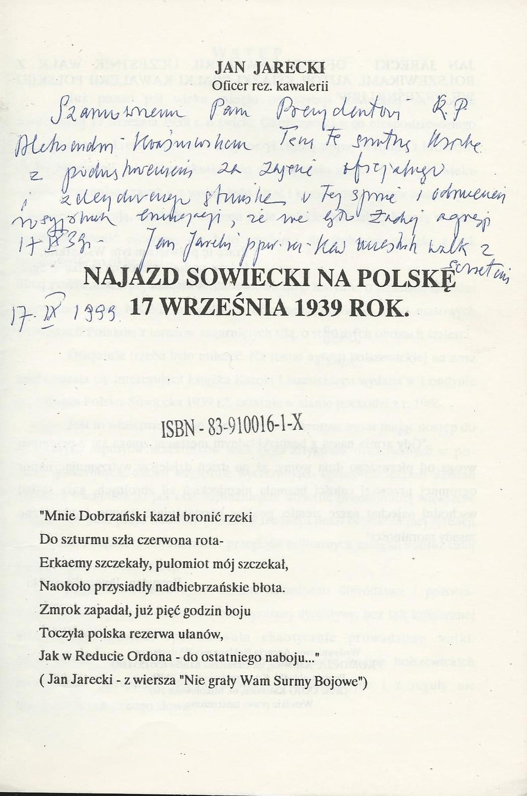 Treść dedykacji: Szanownemu Panu Prezydentowi R.P. Aleksandrowi Kwaśniewskiemu (dalsza część dedykacji nieczytelna).