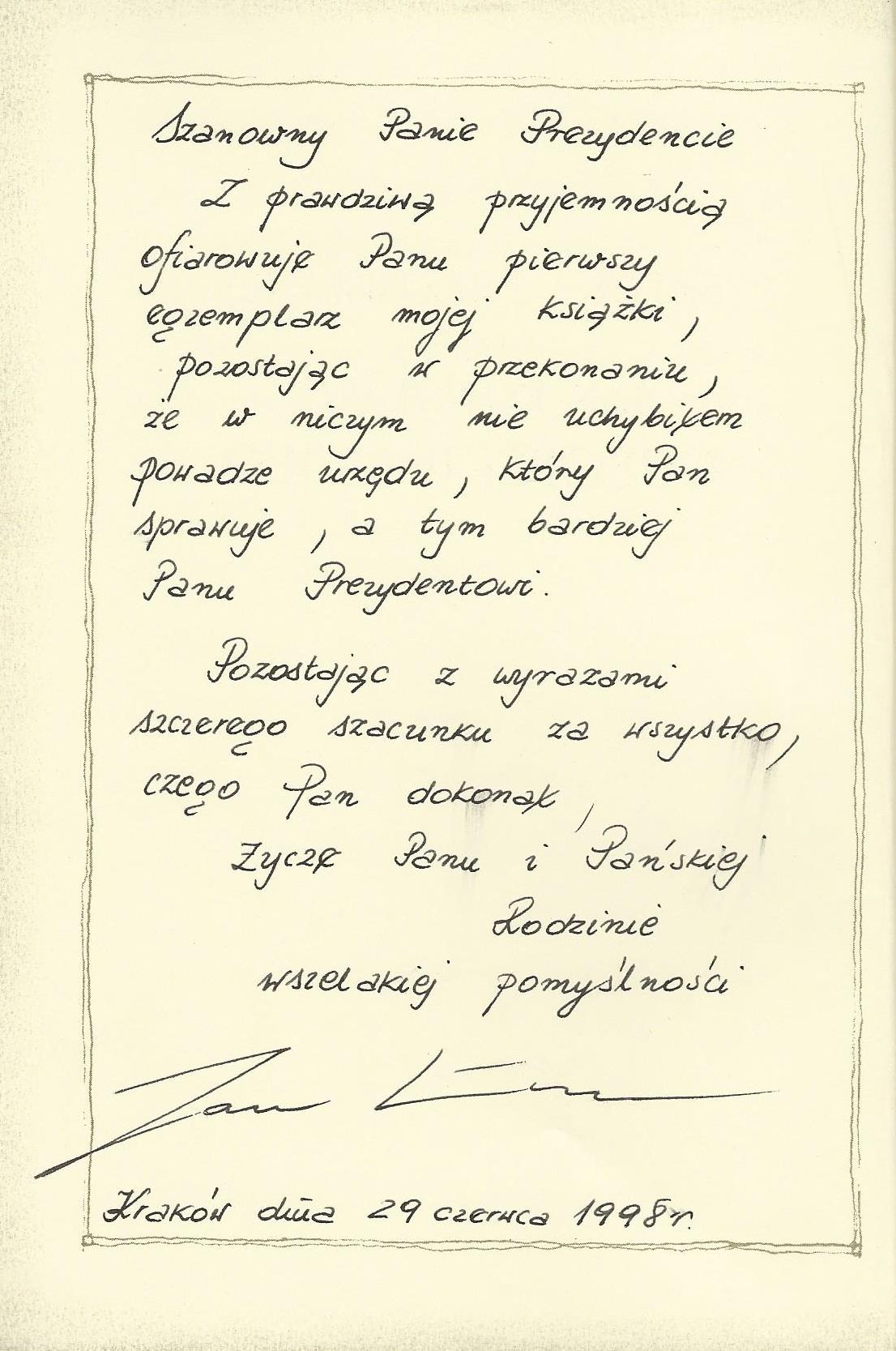 Treść dedykacji: Szanowny Panie Prezydencie Z prawdziwą przyjemnością ofiaruje Panu pierwszy egzemplarz mojej książki, pozostając w przekonaniu, że w niczym nie uchybiłem powadze urzędu, który Pan sprawuje, a tym bardziej Panu Prezydentowi. Pozostając z wyrazami szczerego szacunku za wszystko, czego Pan dokonał, Zyczę Panu i Pańskiej Rodzinie wszelkiej pomyślności Jan Kościuszko Kraków dnia 29 czerwca 1998 r.