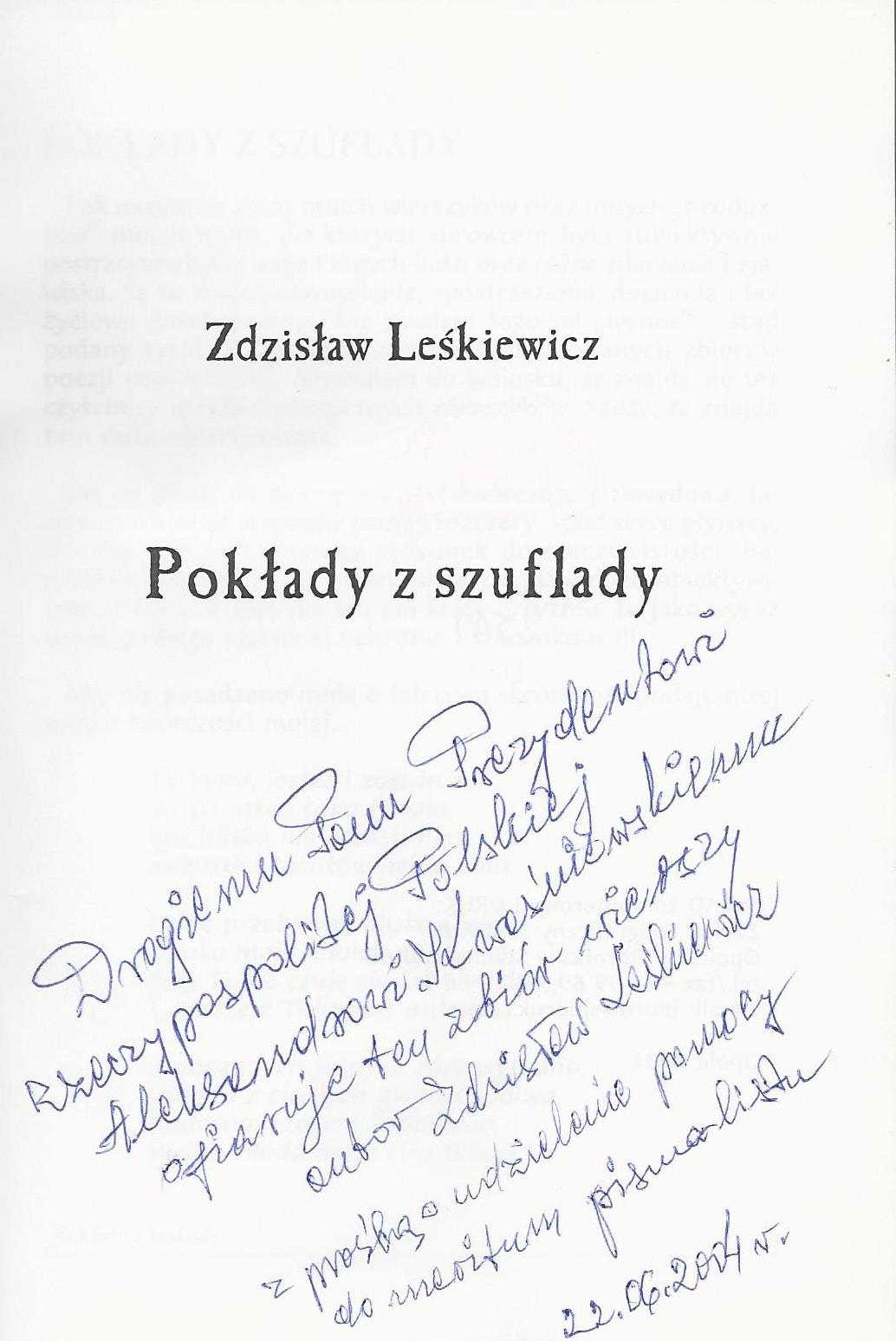 Treść dedykacji: Drogiemu Panu Prezydentowi Rzeczypospolitej Polskiej Aleksandrowi Kwasniewskiemu ofiaruję ten zbiór wierszy autor Zdzisdław Leśkiweicz z prosbą o udzilenie pomocy do meritum pisania listu 22. 06. 2004 r.