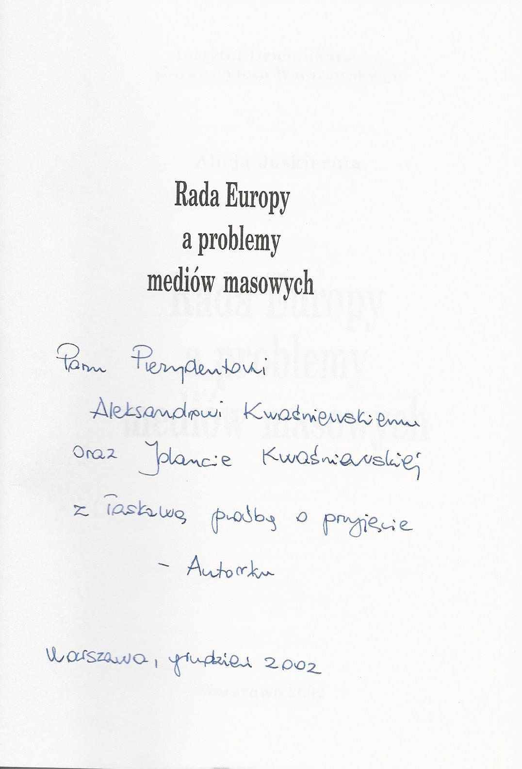 Treść edykacji: Panu Prezydentowi oraz Jolancie Kwaśniewskiej z łaskawą prośbą o przyjęcie - Autorka Warszawa, grudzień 2002