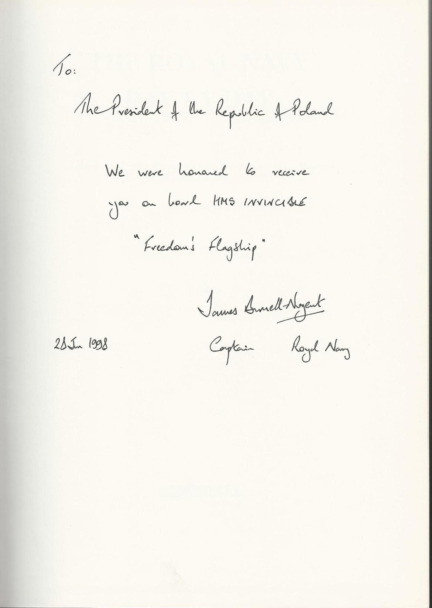 To: The President of the Republic of Poland, We were honored to receive you on board HMS INVINCIBLE " Freedom's Flagship" James ...(podpis nieczytelny) Captain Royal Navy