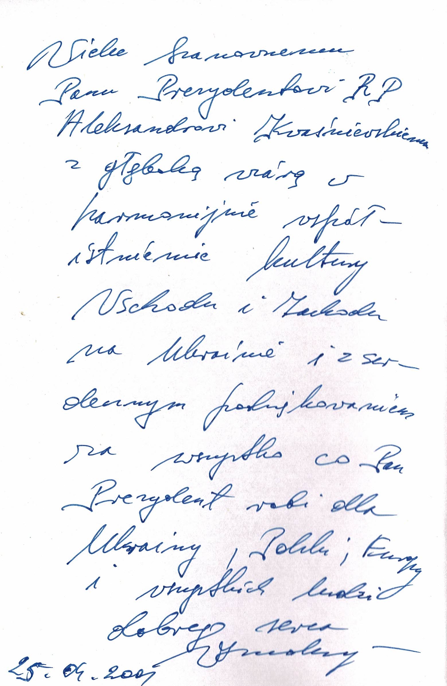 Treść dedykacji: Wielce Szanownemu Panu Prezydentowi RP Aleksandrowi Kwaśniewskiemu z głęboką wiarą w harmonijne współistnienie kultury Wschodu i Zachodu i z serdecznym podziękowaniem za wszystko co Pan Prezydent robi dla Ukrainy, Polski i Europy i wszystkich ludzi dobrego serca.