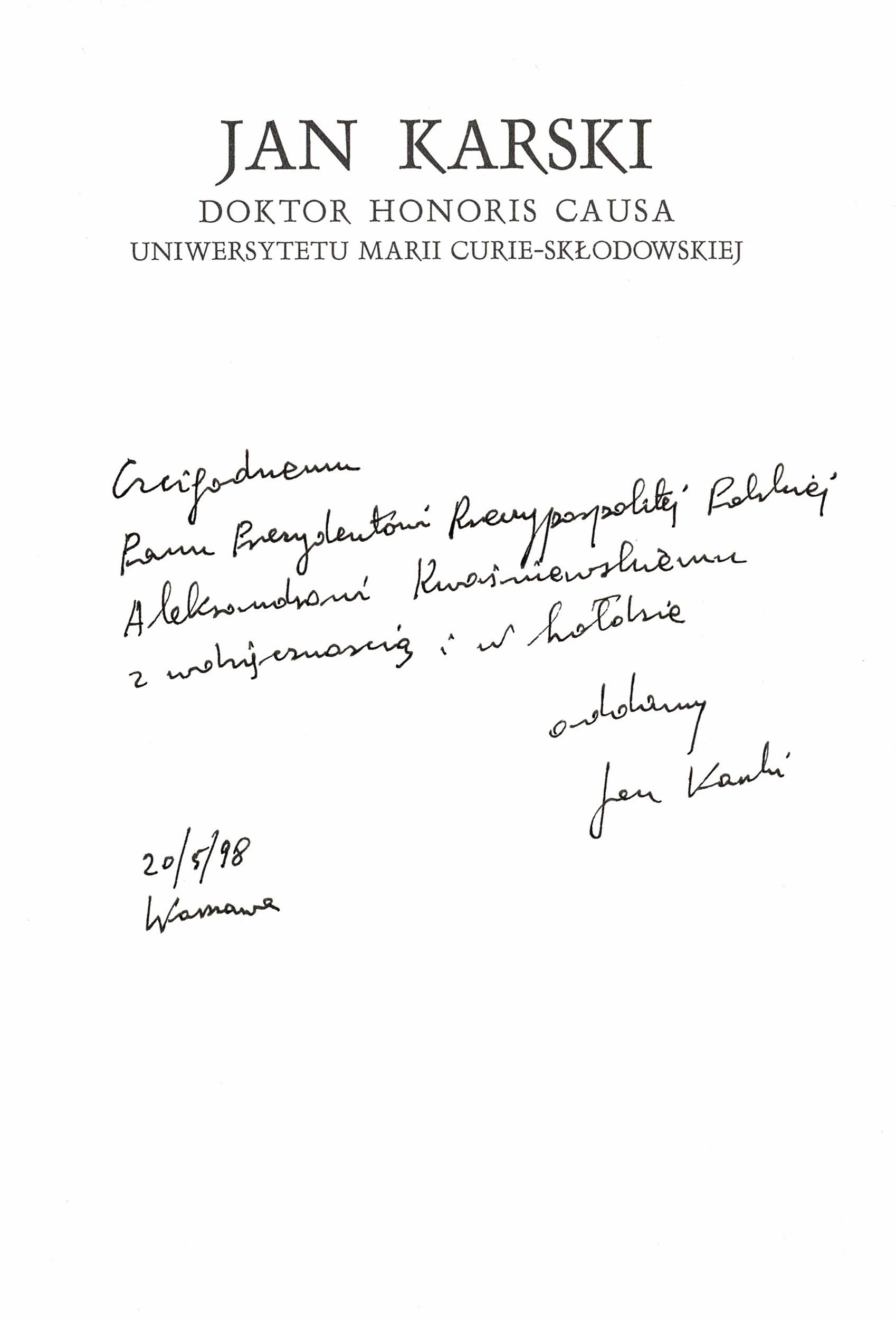 Treść dedykacji: Czcigodnemu Panu Prezydentowi Rzeczypospolitej Polskiej Aleksandrowi Kwaśniewskiemu z wdzięcznością i w hołdzie - oddany Jan Karski 20/05/1998 Warszawa