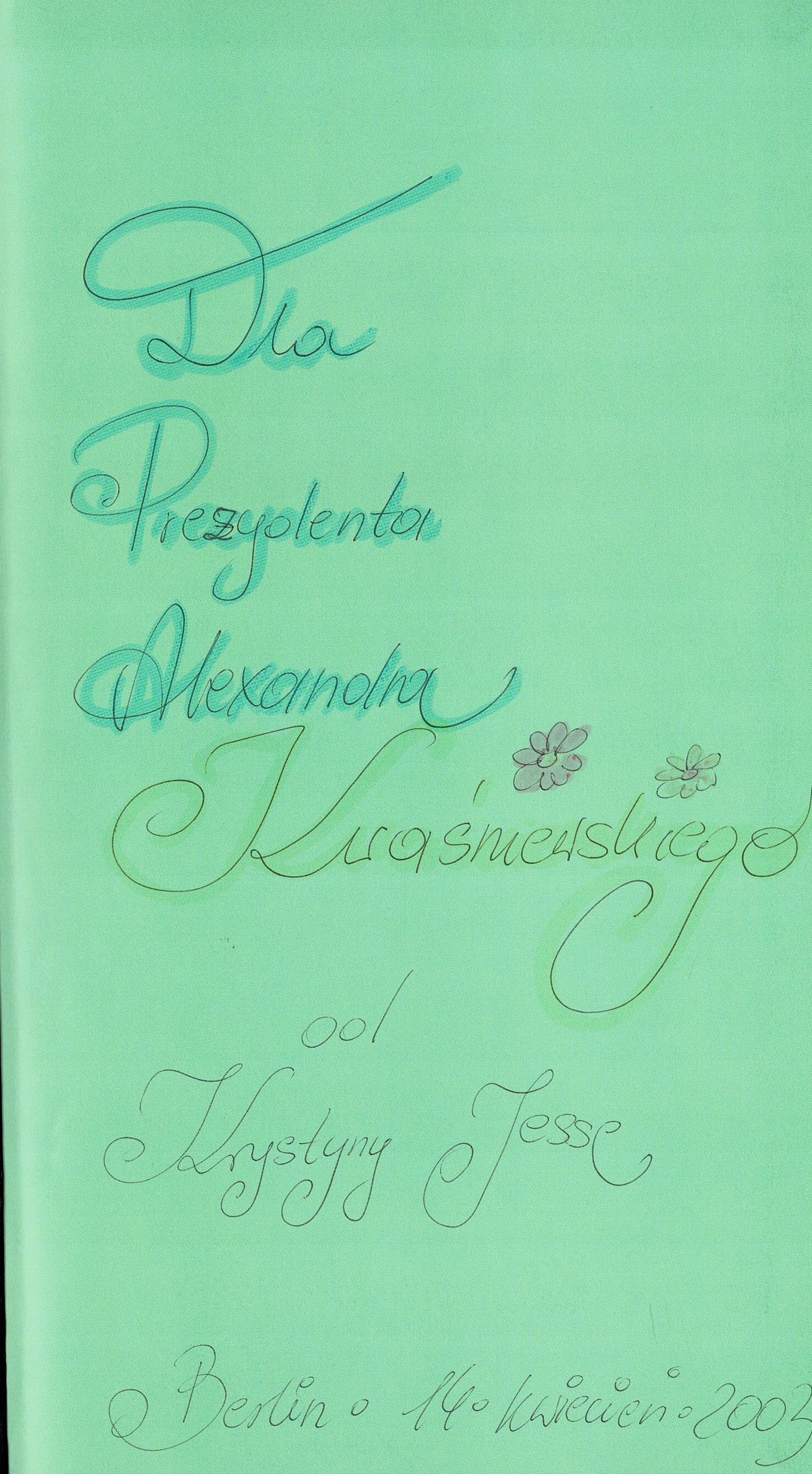Treść dedykacji: Dla Prezydenta Kwaśniewskiego od Krystyny Jesse. Berlin 14 kwiecień 2003