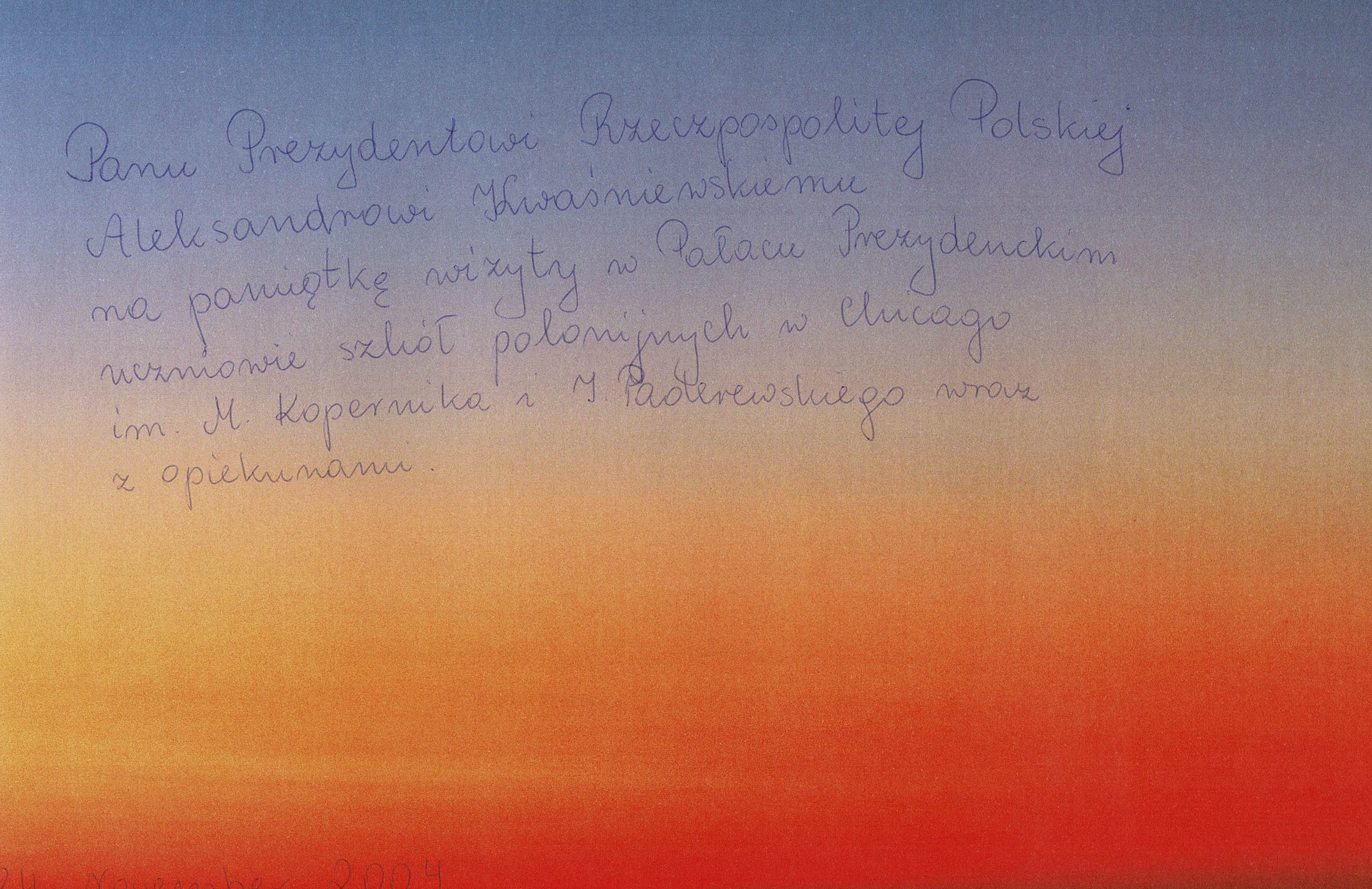 Treść dedykacji: Panu Prezydentowi Rzeczypospolitej Polskiej Aleksandrowi Kwaśniewskiemu na pamiątkę wizyty w Pałacu Prezydenckim uczniowie szkół polonijnych w Chicago im. M. Kopernika i J. Padarewskiego wraz z opiekunami