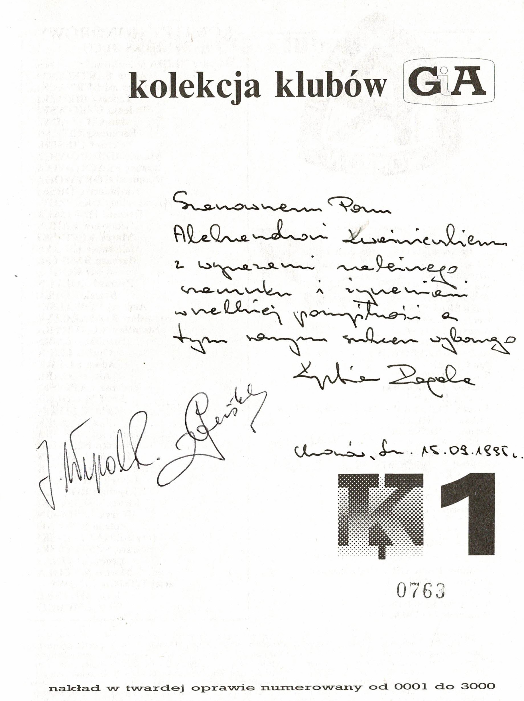 Treść dedykacji: Szanownemu Panu Aleksandrowi Kwaśniewskiemu z wyrazami należnego szacunku i życzeniami wszelkiej pomyślnościa tym samym sukcesu wyborczego