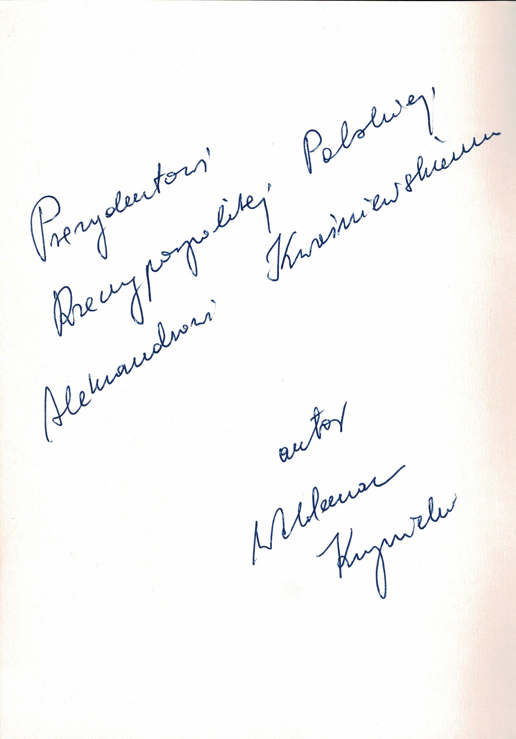 Treść dedykacji: Prezydentowi Rzeczypospolitej Polskiej Aleksandrowi Kwaśniewskiego.
