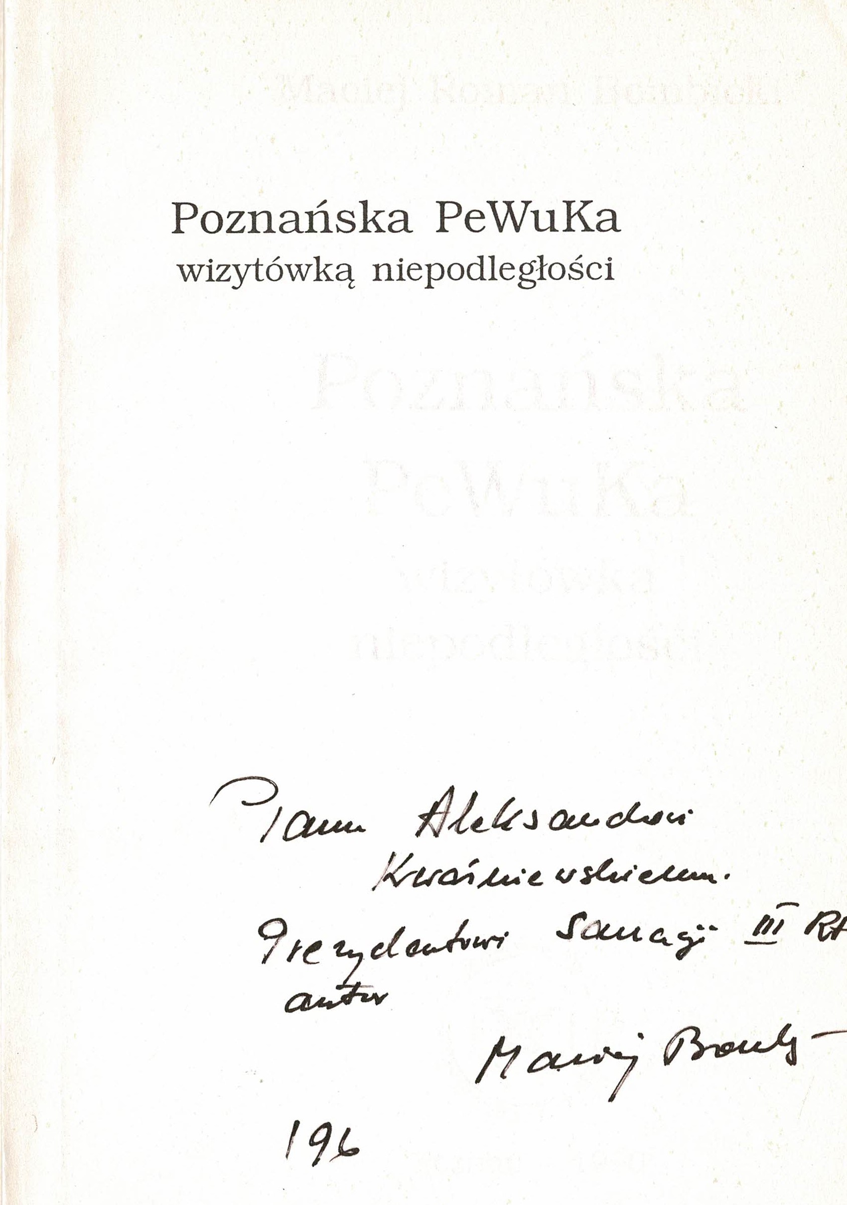 Treść dedykacji: Panu Aleksandrowi Kwaśniewskiemu Prezydentowi kadencji III RP autor Maciej Bombicki