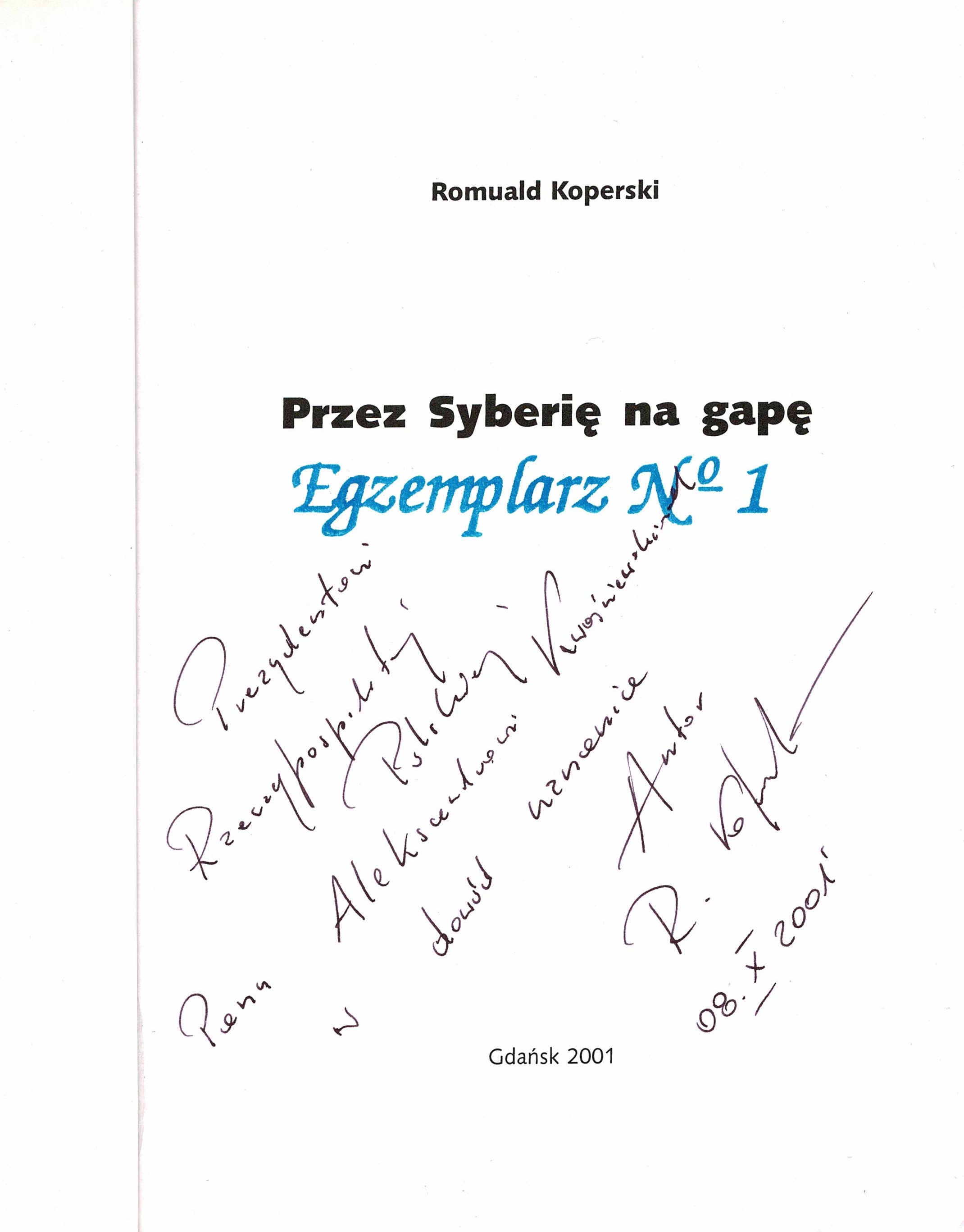 Treść dedykacji: Prezydentowi Rzeczypospolitej Polskiej Panu Aleksandrowi Kwaśniewskiemu w dowód uznania Autor R. Koperski 08. X. 2001
