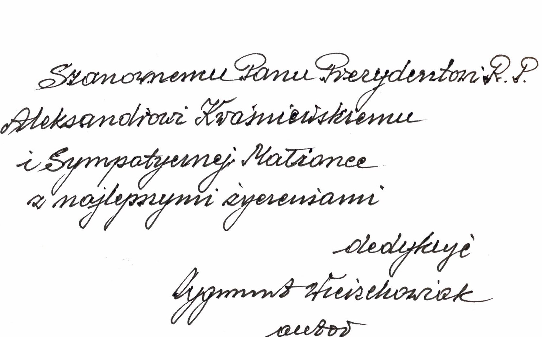 Treść dedykacji: Szanownemu Panu Prezydentowi R.P. Aleksandrowi Kwaśniewskiemu i sympatycznej Małżonce z najlepszymi życzeniami dedykuję Zygm
