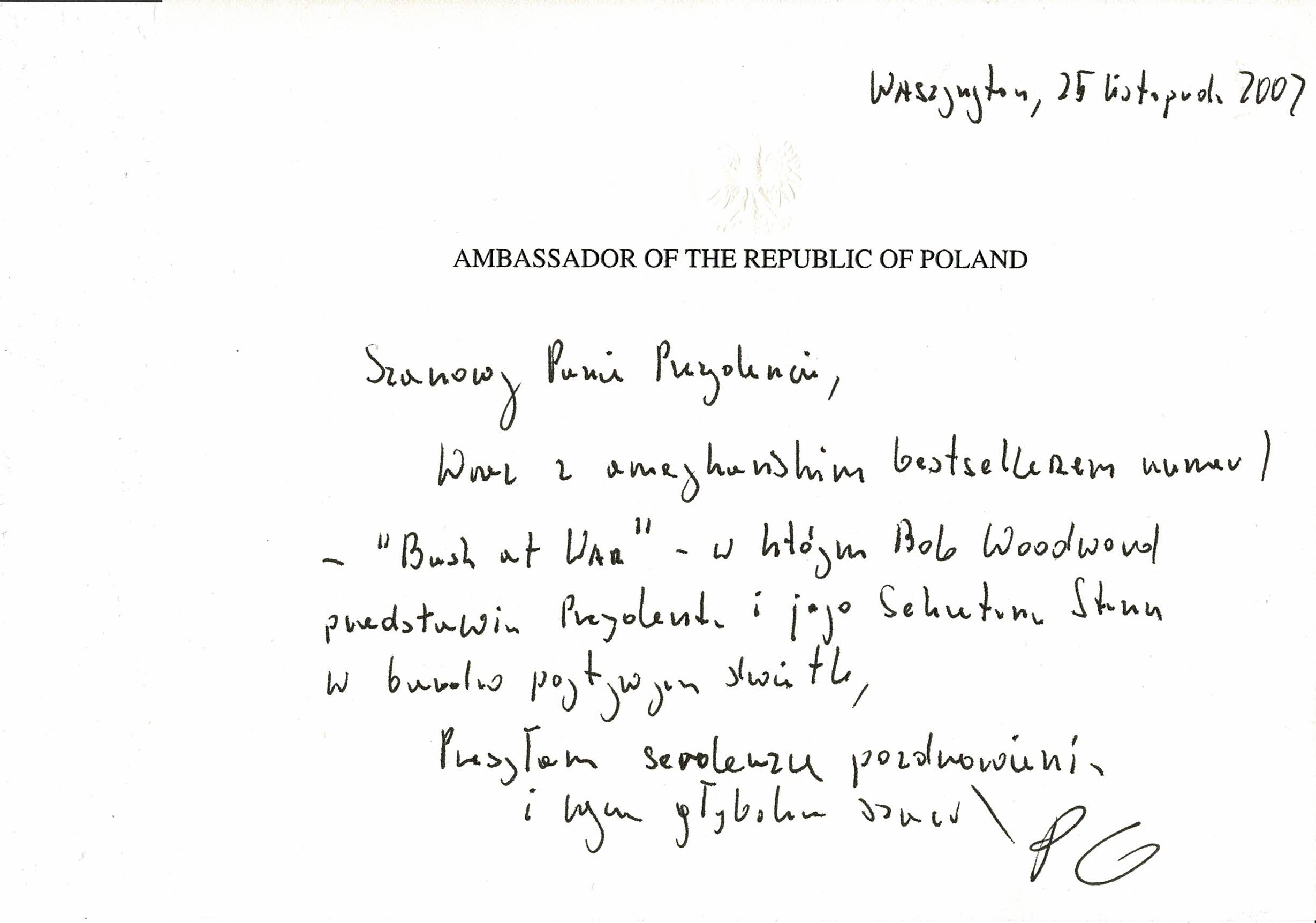 Treść dedykacji: Szanowny Panie Prezydencie, wraz z amerykańskim bestellerem - "Bush at War' - w którym Bon Woodward przedstawia Prezydenta i jego Stanu w bardzo pozytywnym świetle, Przesyłam serdeczne pozdrowienia i wyrazu głębokiego szacunku